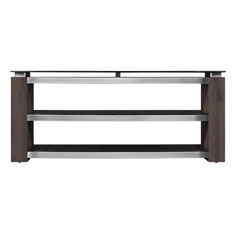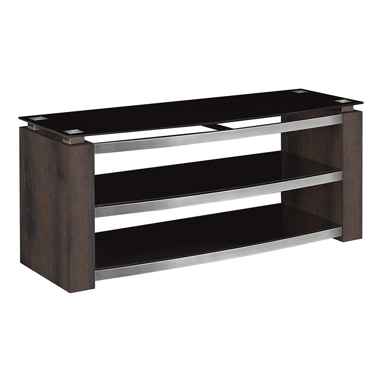 Минимализм дизайна этой полки для ТВ органично дополняют металлические акценты фронтальной части рамы и вставок стекла цвета Brushed Nickel, боковыми стойками цвета Umber Oak и черными закленными стеклами.