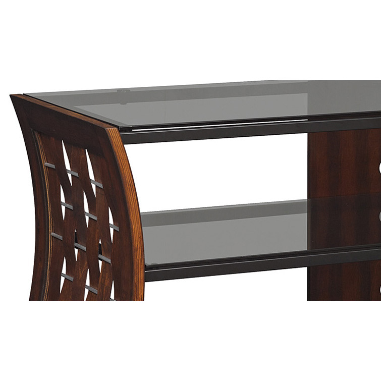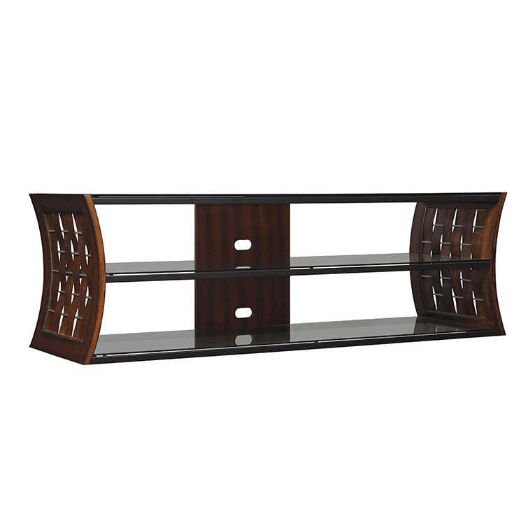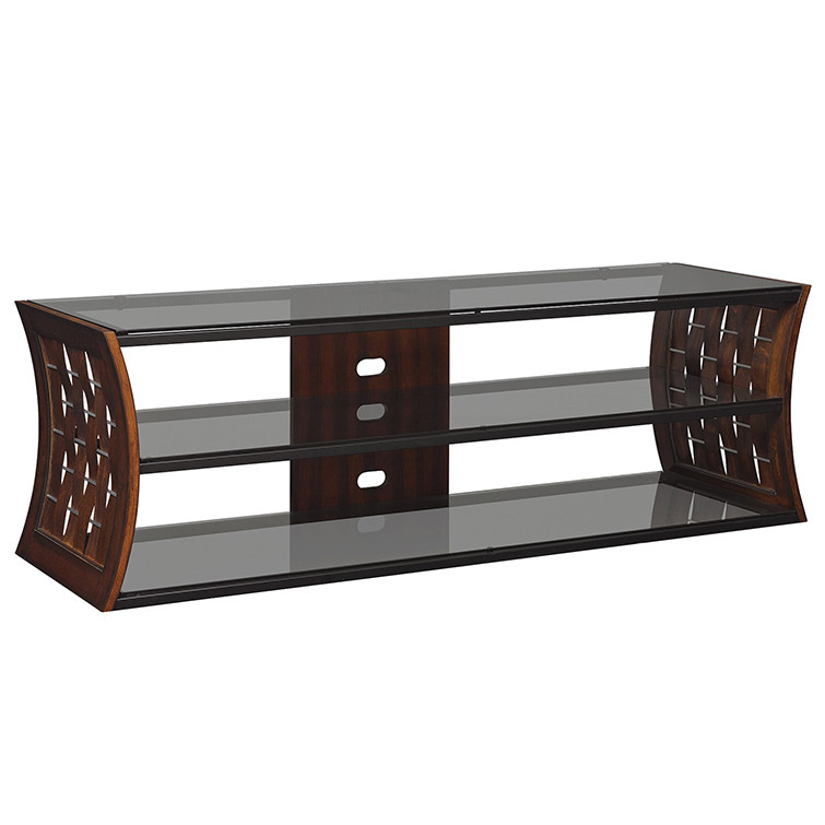 Полки из черного стекла поддерживаются рамой из черного металла. Вогнутые боковые панели имеют тканый узор из дерева и металла. Эта часть с открытой архитектурой обеспечивает достаточно места для хранения AV-компонентов и декоративных элементов.