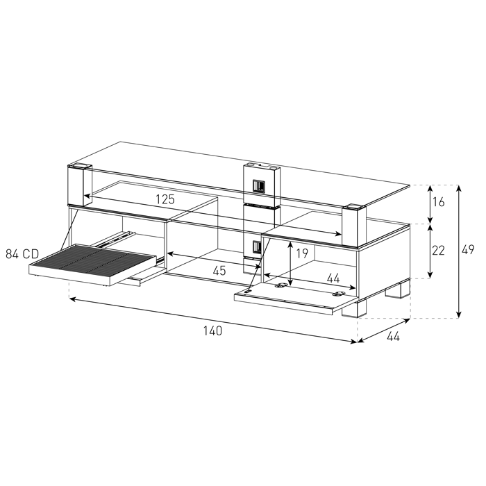 Стойка позволяет разместить большинство плоскопанельных телевизоров до 75 дюймов или весом до 80 кг, а также до 3 компонентов AV, саундбара, звукового проектора или АС центрального канала. Каркас тумбы закреплен на четырех ножках со скрытыми роликами для легкого перемещения. Три полки из закаленного прозрачного стекла для размещения AV-компонентов. В левой части расположен один выдвижной ящик для размещения аксессуаров. В правой части полка скрытая откидной дверцей. Внутренняя полка для индивидуального хранения медиа-носителей и аксессуаров. Встроенная система управления кабелями CMS скрывает и маршрутизирует провода и соединительные кабели в то время как внутренние слоты обеспечивают надлежащую циркуляцию воздуха для конвективного охлаждения Ваших компонентов.