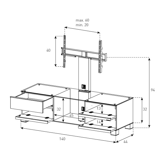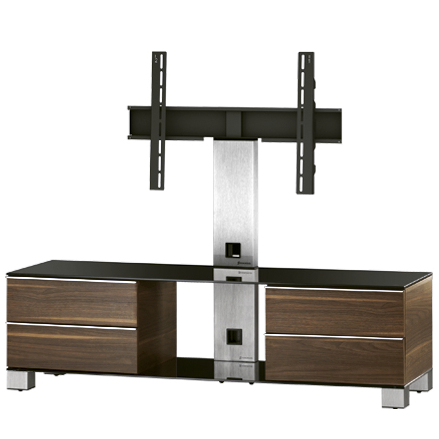 Cтойка под телевизор Sonorous MD 8540-B-INX-WNT этот впечатляющий декор из МДФ с отделкой орех, серебра и матового черного стекла предлагает универсальность и функциональность. Стойка позволяет разместить большинство плоскопанельных телевизоров до 75 дюймов или весом до 50 кг, а также до 5 компонентов AV, саундбара, звукового проектора или АС центрального канала, Элегантная стальная колонна с кронштейном и функцией поворота для крепления телевизора. Каркас тумбы закреплен на четырех ножках со скрытыми роликами для легкого перемещения. Верхняя полка из закаленного стекла черного цвета. Одна стеклянная полка по центру для размещения AV-компонентов. В левой части расположен один выдвижной ящик и одна полка скрытая откидной дверцей. В правой части две полки скрытых двумя откидными дверцами. Внутренние полки и ящик для индивидуального хранения медиа-носителей и аксессуаров. Встроенная система управления кабелями CMS скрывает и маршрутизирует провода и соединительные кабели в то время как внутренние слоты обеспечивают надлежащую циркуляцию воздуха для конвективного охлаждения Ваших компонентов.