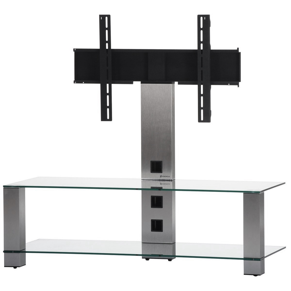 Стойка под телевизор выполнена из анодированного алюминия и закаленного стекла, благодаря чему легкая по виду конструкция обладает высокой прочностью. Для подвеса телевизора предусмотрено специальное крепление, выдерживающее значительную нагрузку (до 50 килограмм). На двух стеклянных полках можно удобно расположить аудио/видео компоненты домашнего кинотеатра. Встроенная система управления кабелями позволяет исключить спутывание шнуров питания и сигнальных кабелей.