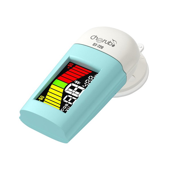 ST-720 - хроматический тюнер от компании Cherub. Вместо традиционной прищепки тюнер крепится к перу грифа при помощи присоски. Благодаря такому решению он выглядит современно и по-настоящему стильно, обладает невероятно компактным размером и не портит внешний вид инструмента. В данной модели полностью отсутствуют кнопки: включается и выключается тюнер поворотом корпуса на 90°. Яркий дисплей позволяет без труда использовать тюнер при любом уровне освещенности, а высококачественный пьезоэлемент гарантирует быструю и точную настройку.