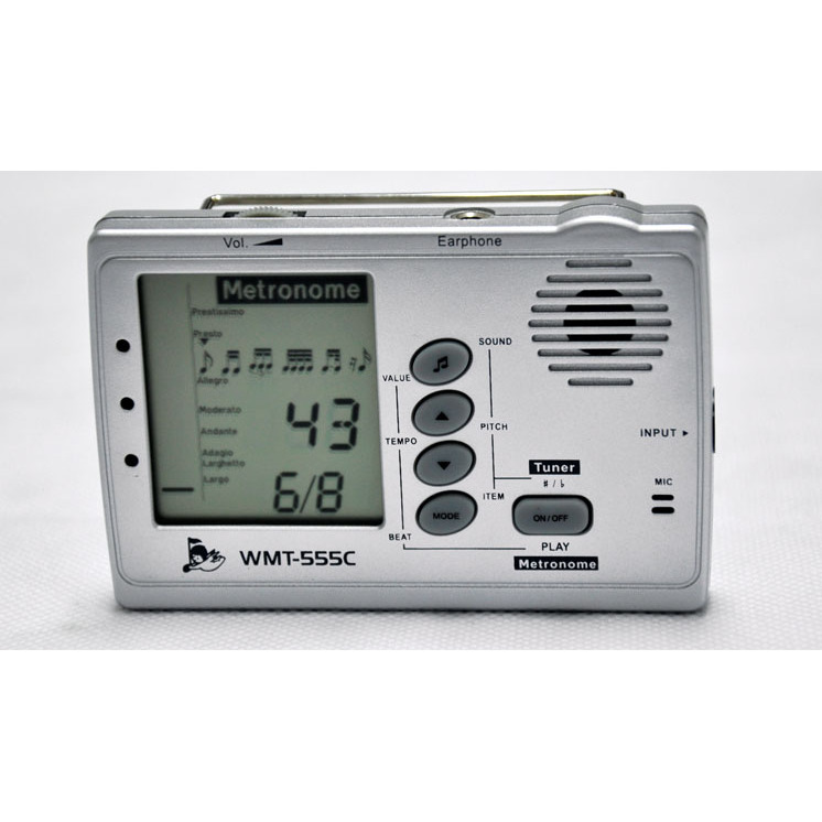 Кроме того, WMT-555C оснащен тон-генератором с возможностью выбора режима работы (хроматический, гитара, бас, скрипка, укулеле) и диапазоном от A2 до A6. Его громкость регулируется специальным колесиком.