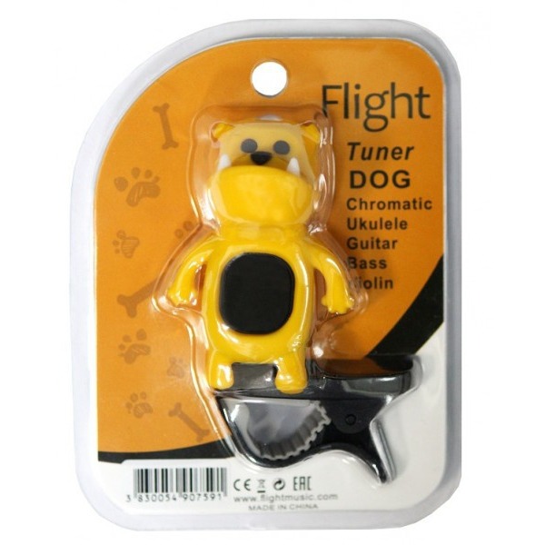FLIGHT DOG YELLOW - это хроматический тюнер-мультяшка в форме бульдога, удобная цветная индикация (оранжевый - тюнер не настроен, зеленый - тюнер настроен), режимы настройки: чроматический, гитара, бас-гитара, скрипка, укулеле C, укулеле D, цвет: желтый.