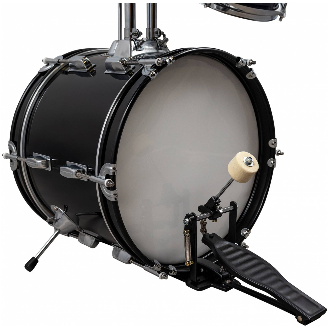 Уменьшенная ударная установка с удобной и прочной конструкцией. Состоит из 14" бас-барабана с классическим ободом, 10" малого барабана (на том-холдере) и 8" тома. Том-холдер для двух барабанов и держатель тарелки. В комплекте — педаль, стул и палочки. Стильный чёрный цвет и хромированная фурнитура.