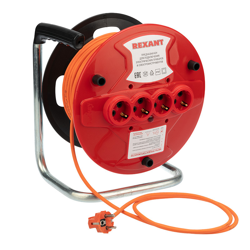 Удлинитель электрический Rexant 11-7085 Удлинитель-шнур на катушке ПВС 3х1.0, 50 м, 4 гнезда, с/з, 10 А, 2200 Вт, IP20, оранжевый