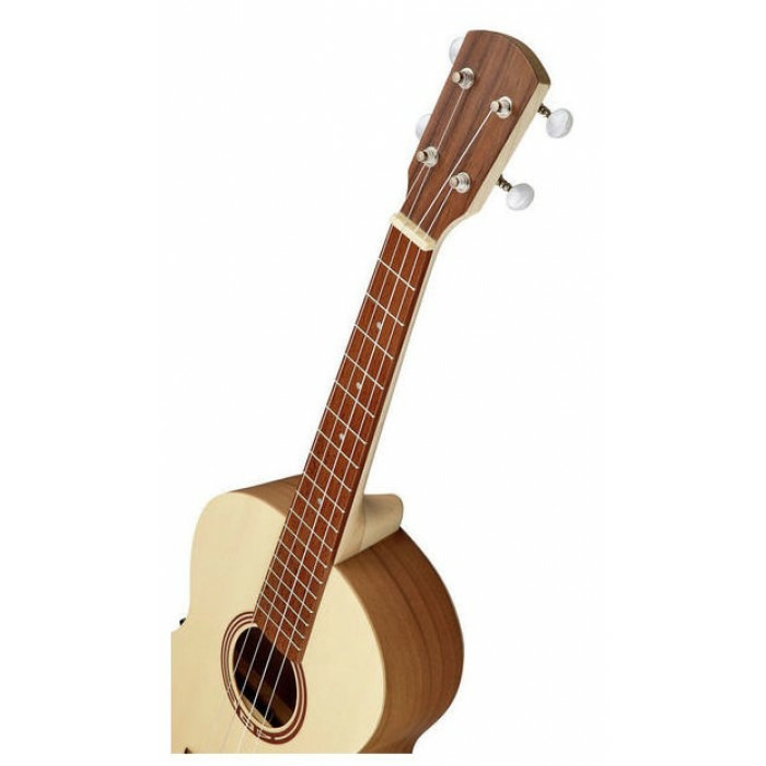 Укулеле-баритон с верхней декой из массива ели, ореховым корпусом и изысканной матовой отделкой.