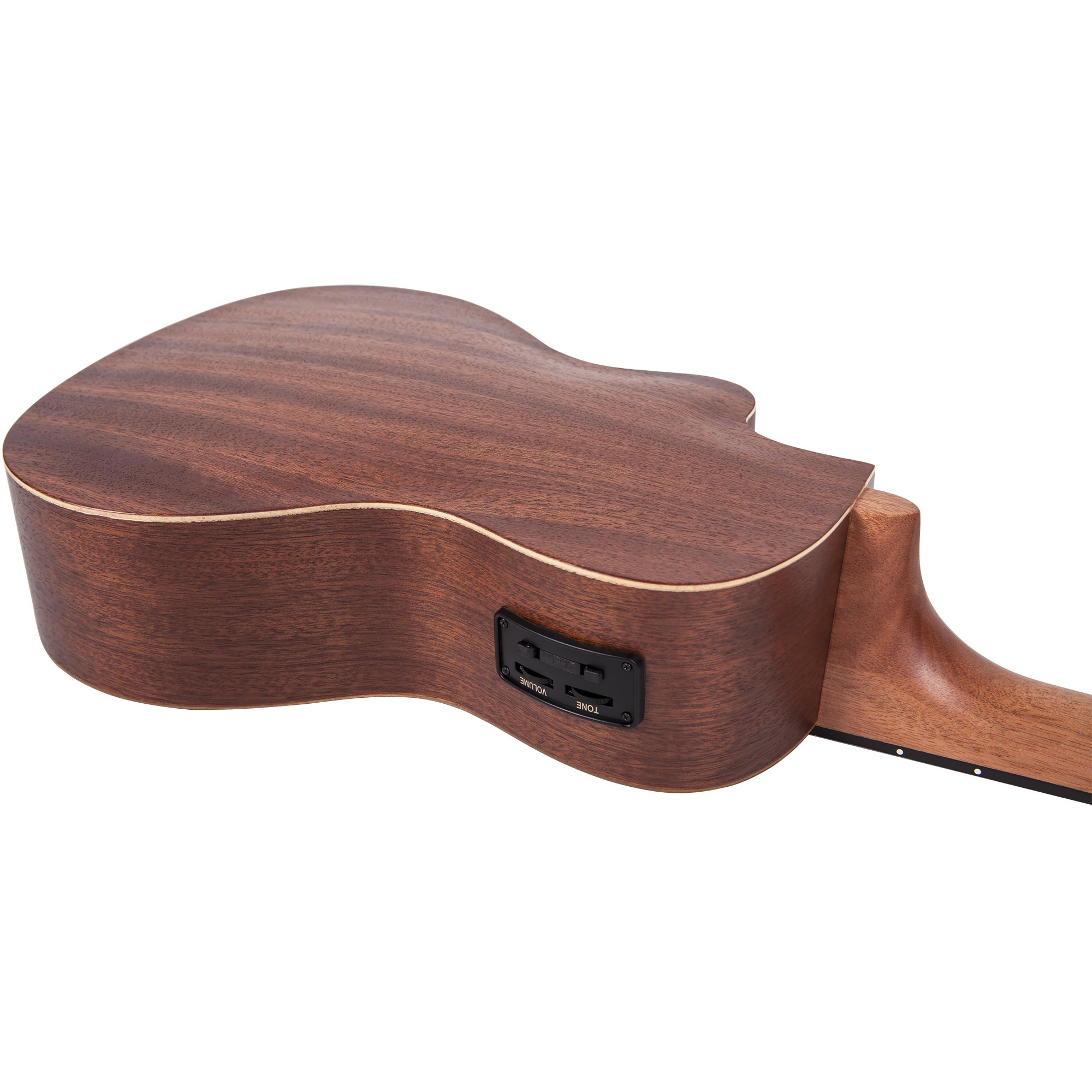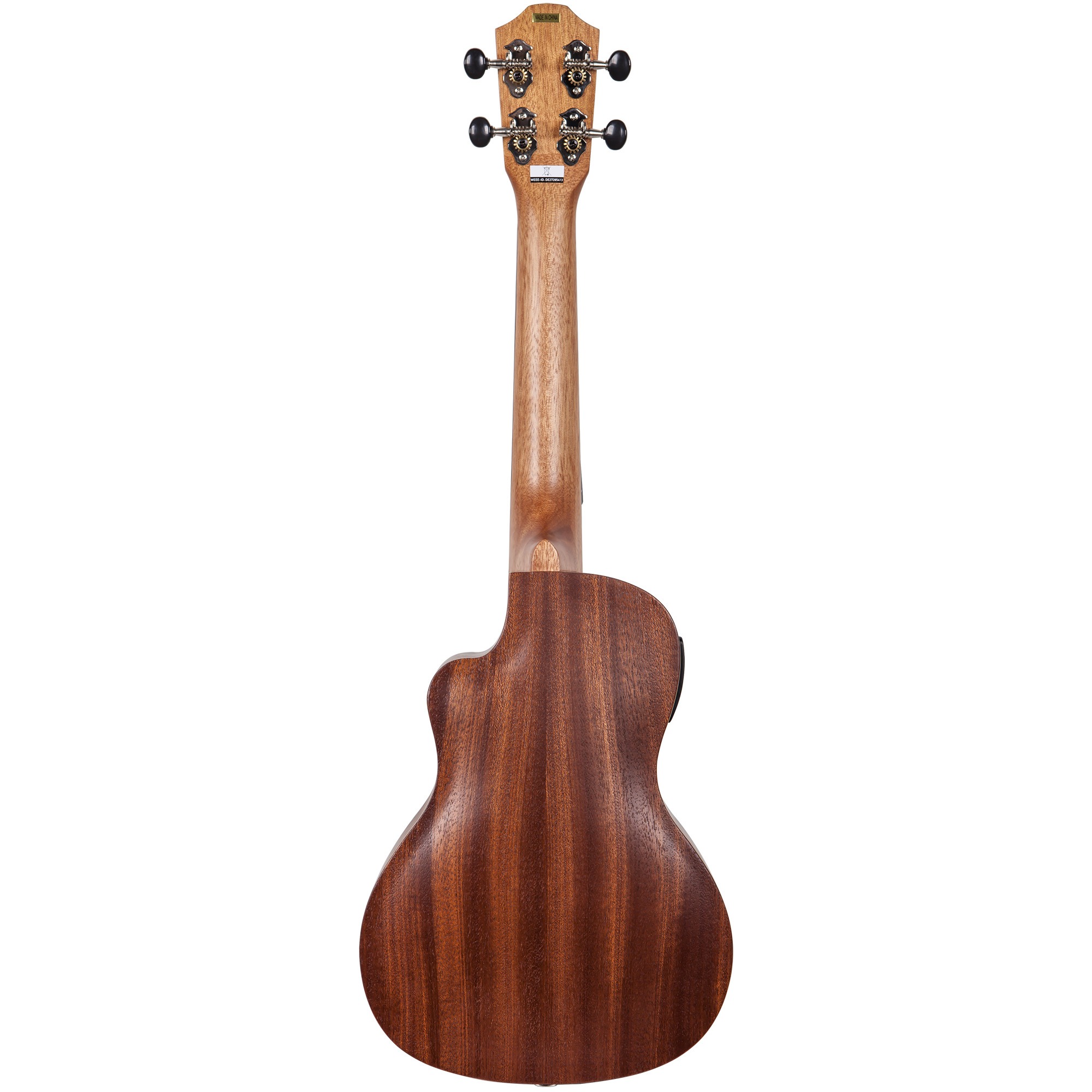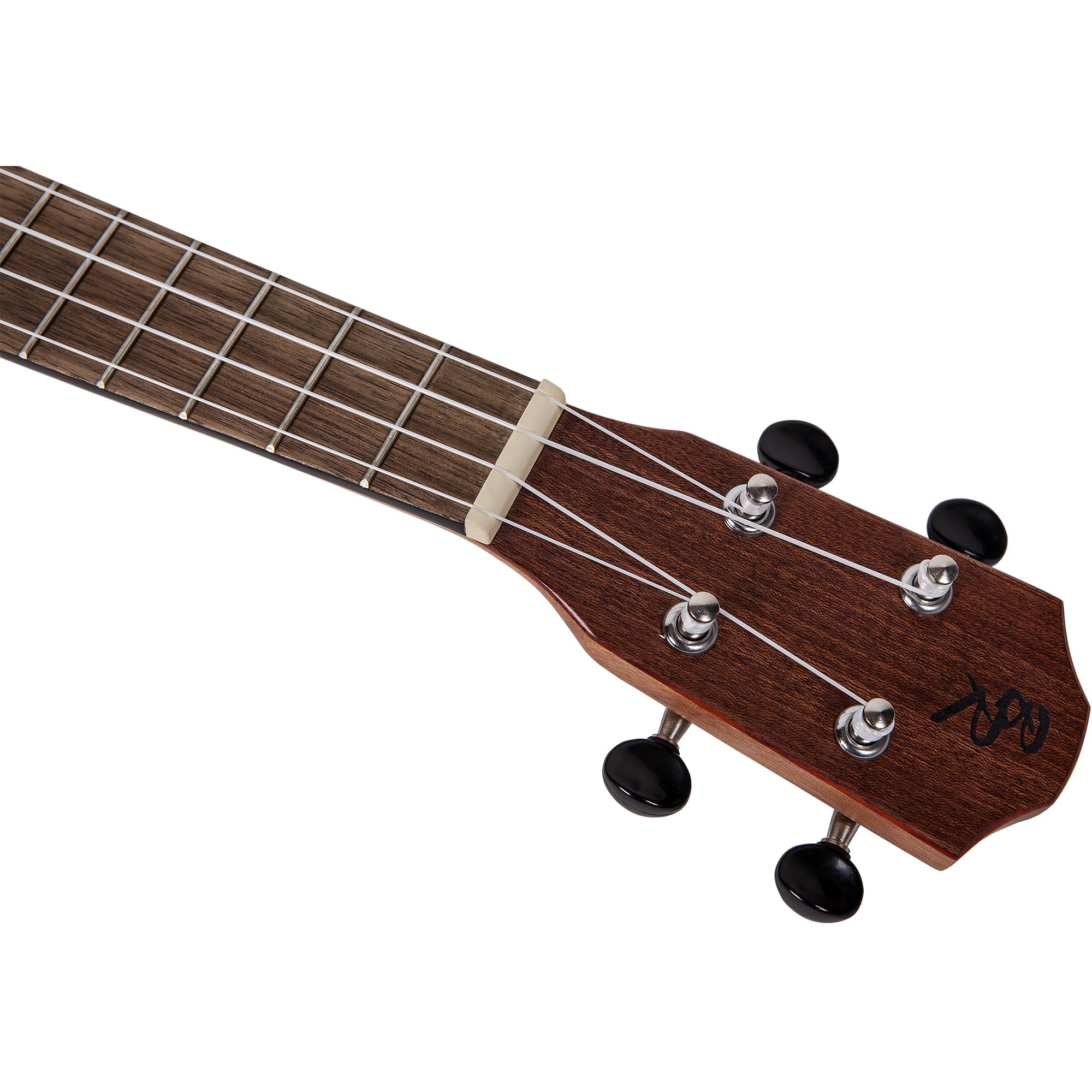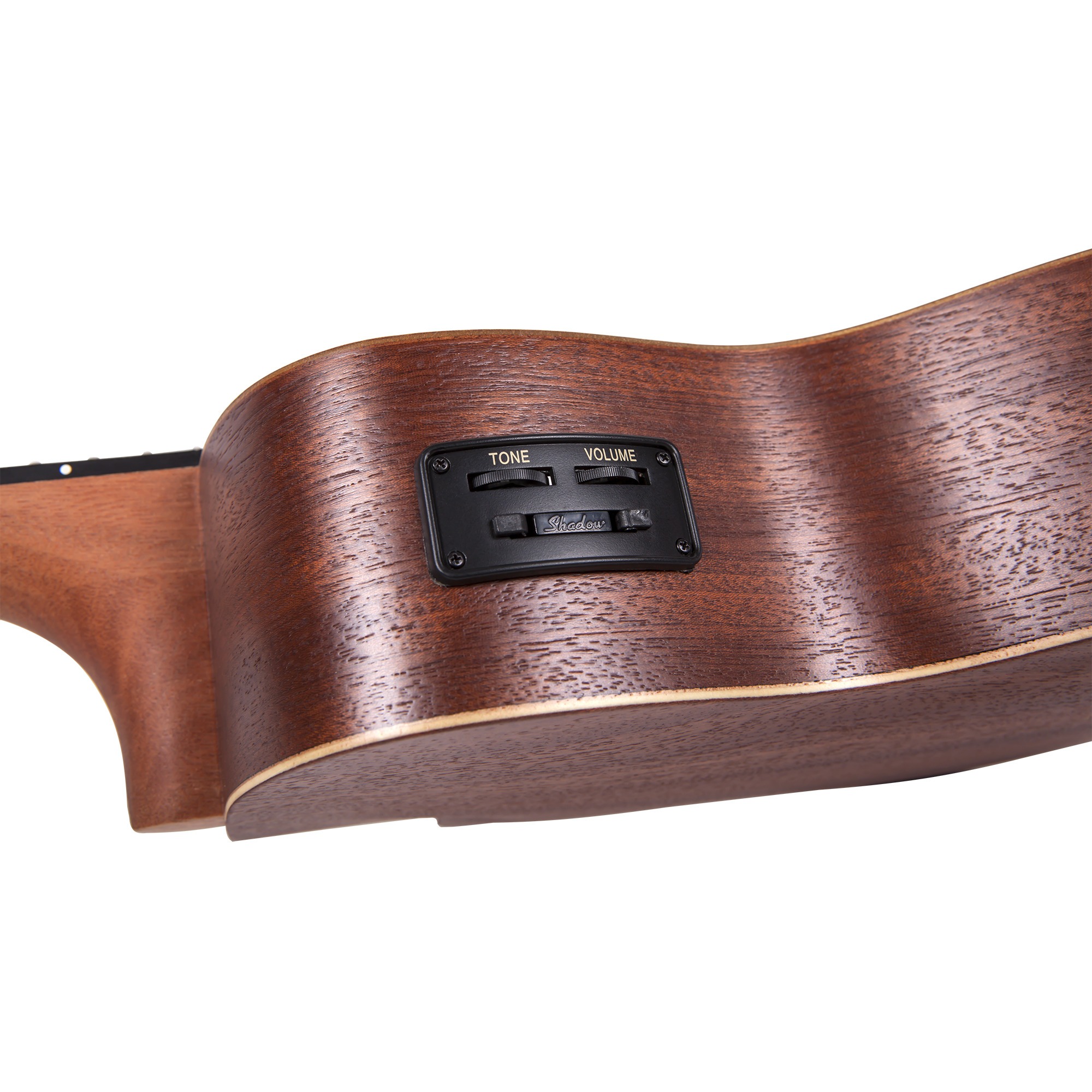 Корпус BATON ROUGE V2-CCE sun выполнен из красного дерева, гриф – из материала нато. Накладка на гриф и собственно бридж сделаны из ореха. Ширина порожка составляет 35 мм, он и маркеры бриджа выполнены из материала Nubone, являющегося разновидностью популярного материала TUSQ, но с лучшими тональными характеристиками. Открытые колки сделаны хромированными, у них черные кнопки. Отделка выполнена в натуральном цвете с матовым оттенком и открытыми порами. Наконец, используется звукосниматель Shadow JW1, а в темброблоке можно найти регуляторы тона и громкости. В общем, данная гитара подойдет всем музыкантам, играющим на концертных укулеле, который хотят стильный инструмент с современными компонентами и оригинальной, неброской графикой при качественной отделке.
