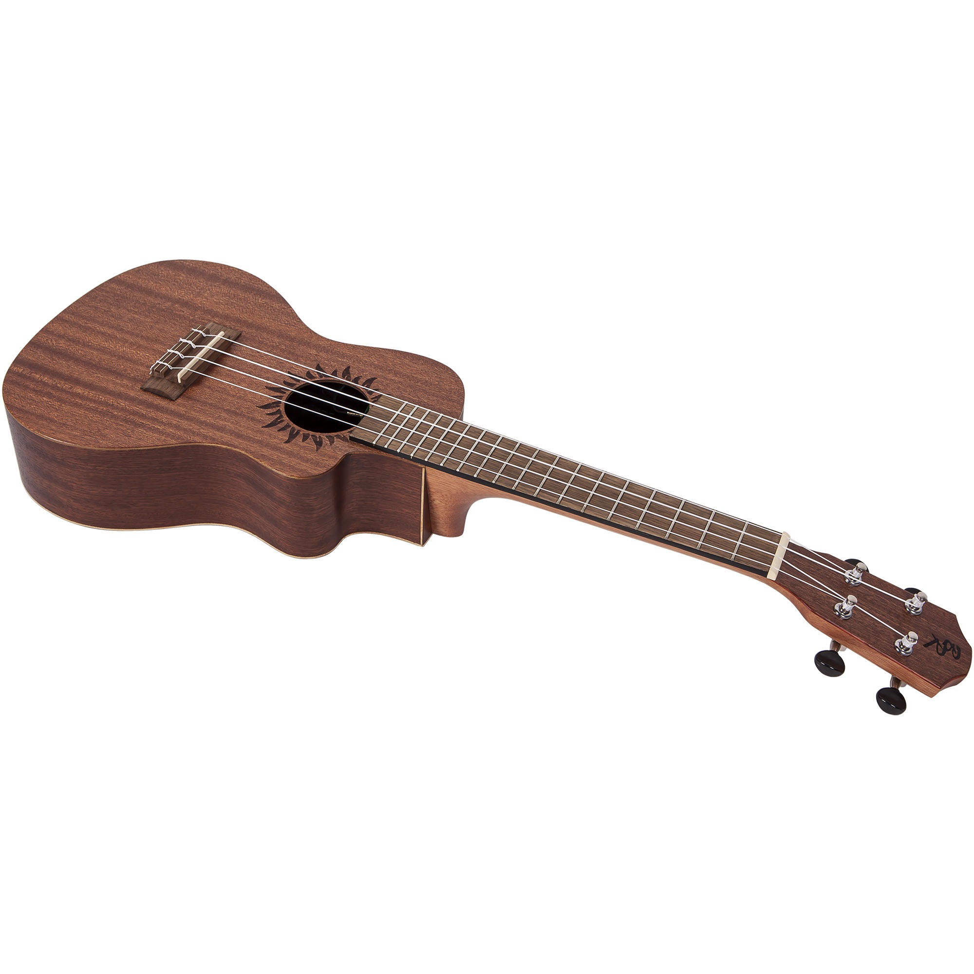 BATON ROUGE V2-CCE sun – концертная укулеле с катавеем, отличающаяся от обычной сопрано чуть более увеличенной мензурой – до 375 мм. Кроме того, отличия касаются и ладов – их 18, а не 12; струн, тем не менее, все так же 4, используются Aquila Nylgut. Данная гитара отличается также и лазерной гравировкой солнца, выполненной вокруг розетки.