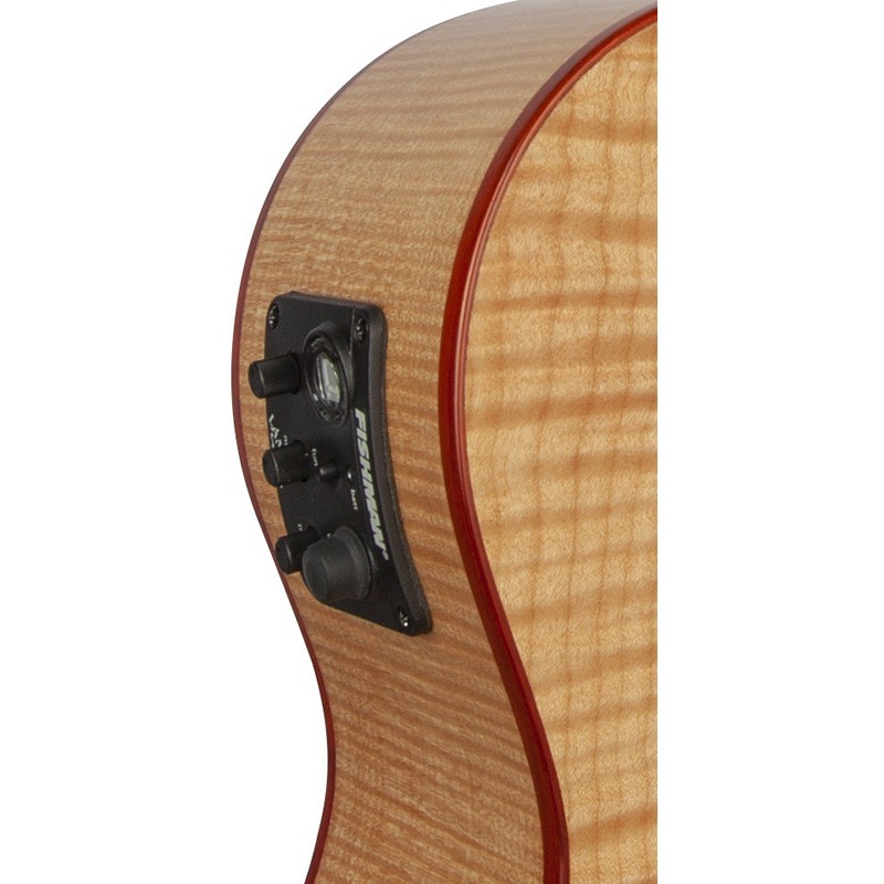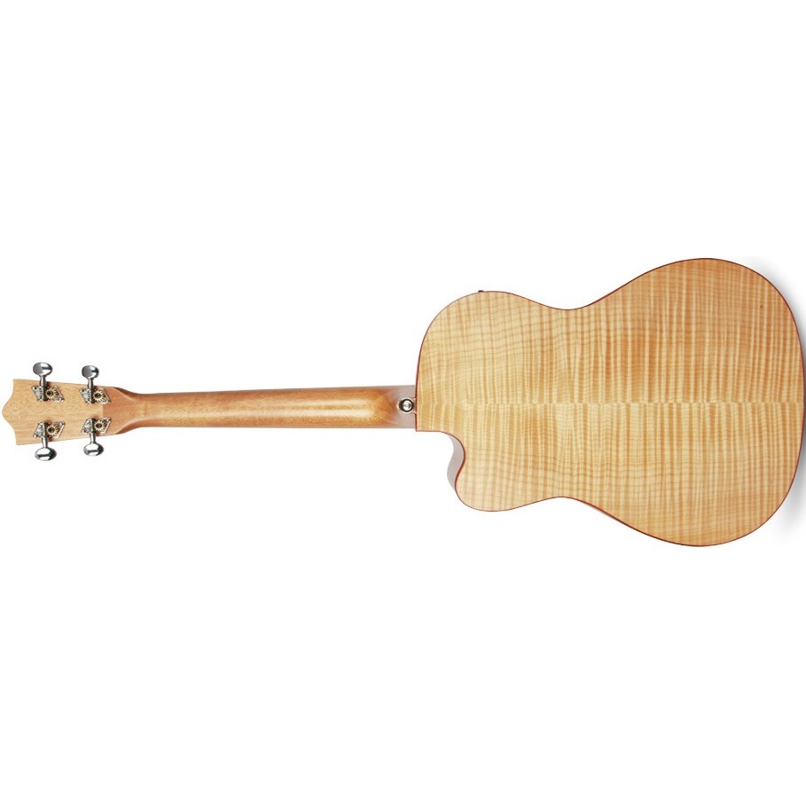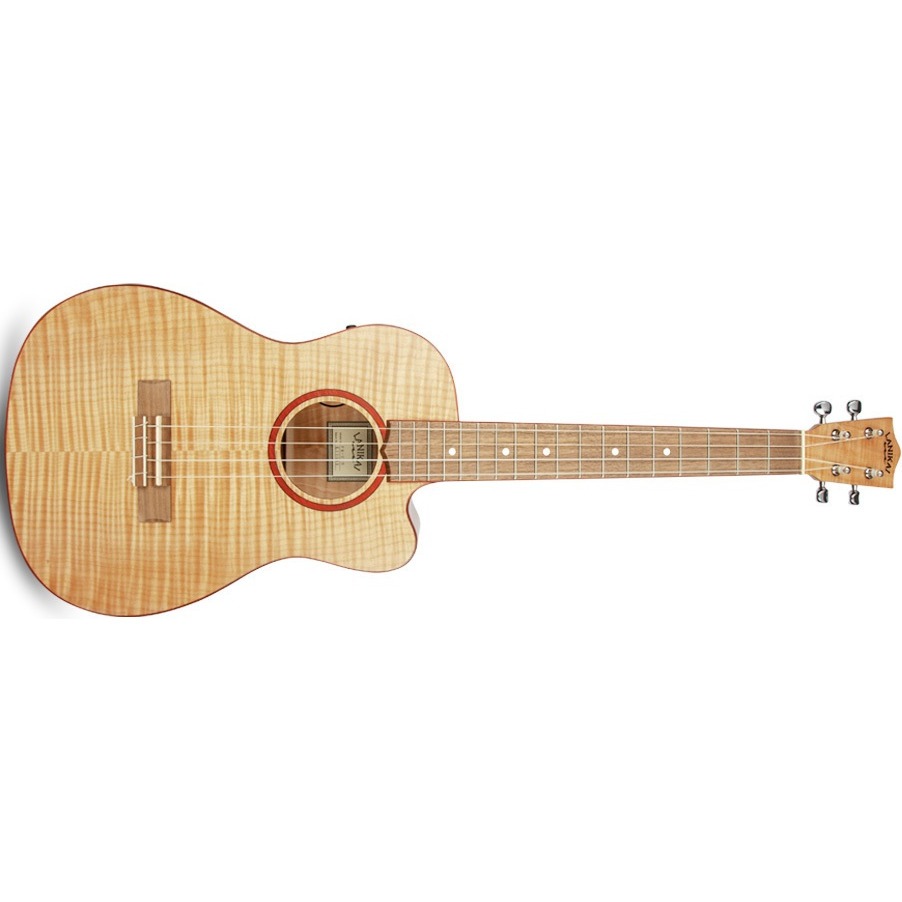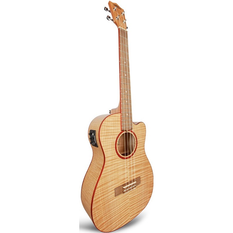 LANIKAI FM-CEB – электроакустическое баритон укулеле из популярной серии Flame Maple. Оно значительно выделяется среди остальных моделей окантовкой и розеткой из Bloodwood дерева, регулируемым анкером, широким профилем грифа и Nubone XB порожками. Преамп Fishman Kula с тюнером позволяет выступать с подключением, не теряя красивого акустического тона, и быстро подстроить гитару при необходимости. Корпус из огненного клена выглядит потрясающе, восхитительно контрастируя с окантовкой красноватого оттенка, а также предоставляет яркий тон с насыщенным среднечастотным диапазоном. Накладка из ореха очень отзывчивая, а хромированные колки с ровным ходом гарантируют точность настройки. При этом за цену укулеле вы еще получите и высококачественный утепленный чехол из прочного, плотного нейлона.