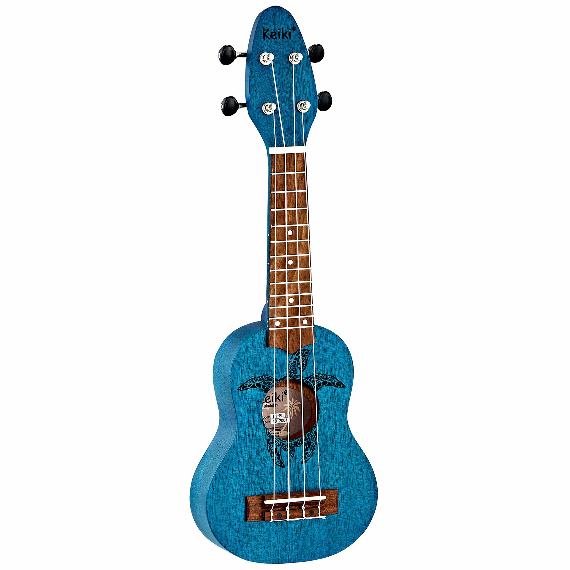 Ortega K1-BL Keiki представляет собой не просто детскую гитару, а уникальное сочетание яркого дизайна и высококачественных материалов. укулеле сопранино. Корпус гитары окрашен в синий цвет, а верхняя дека украшена лазерной гравировкой в форме черепахи. Слово Keiki в названии модели дословно переводится как «младенец», так что такая миниатюрная гитара с 4 струнами и 12 ладами наверняка станет идеальным первым инструментом любого ребенка. Так как гитара создана в размере сопранино (то есть меньше сопрано), производителем рекомендуется использовать вариант настройки A D F# B (стандарт) или же D G E A. Это позволит правильно скорректировать натяжение струн для мягкого, приятного и нежного звучания. Уклулеле K1-ORG Keiki выполнена из древесины окоуме, а длина ее мензуры равняется 284 мм. Открытые колки обладают хромированным напылением.