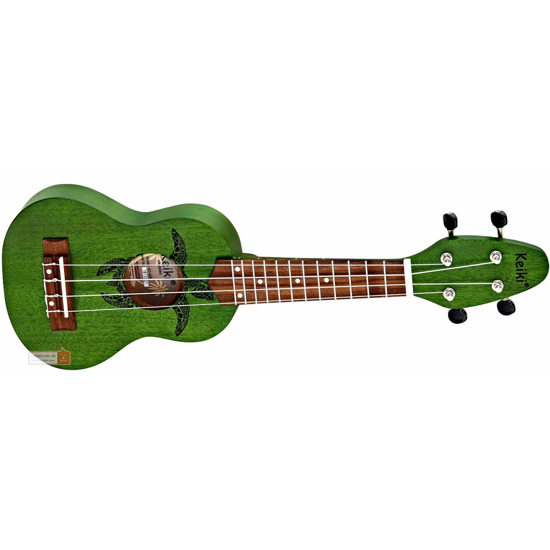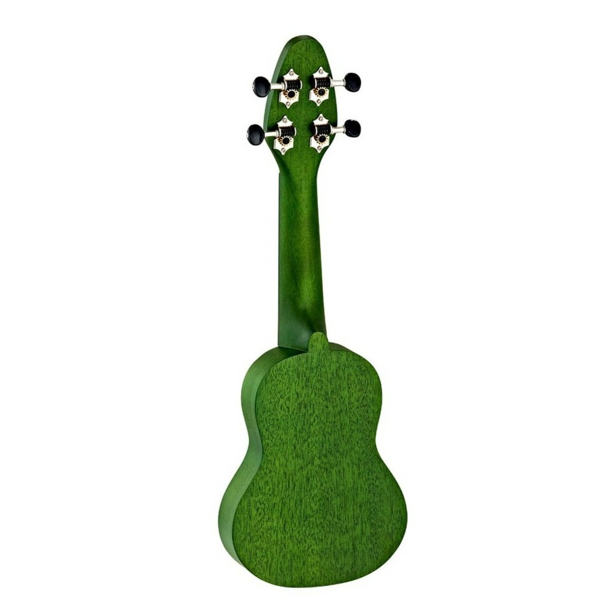 Яркая и необычная укулеле сопранино окрашена в зеленый цвет и дополнена гравировкой в виде черепахи Корпус гитары изготовлен из окоуме, а бридж с грифовой накладкой – из ореха