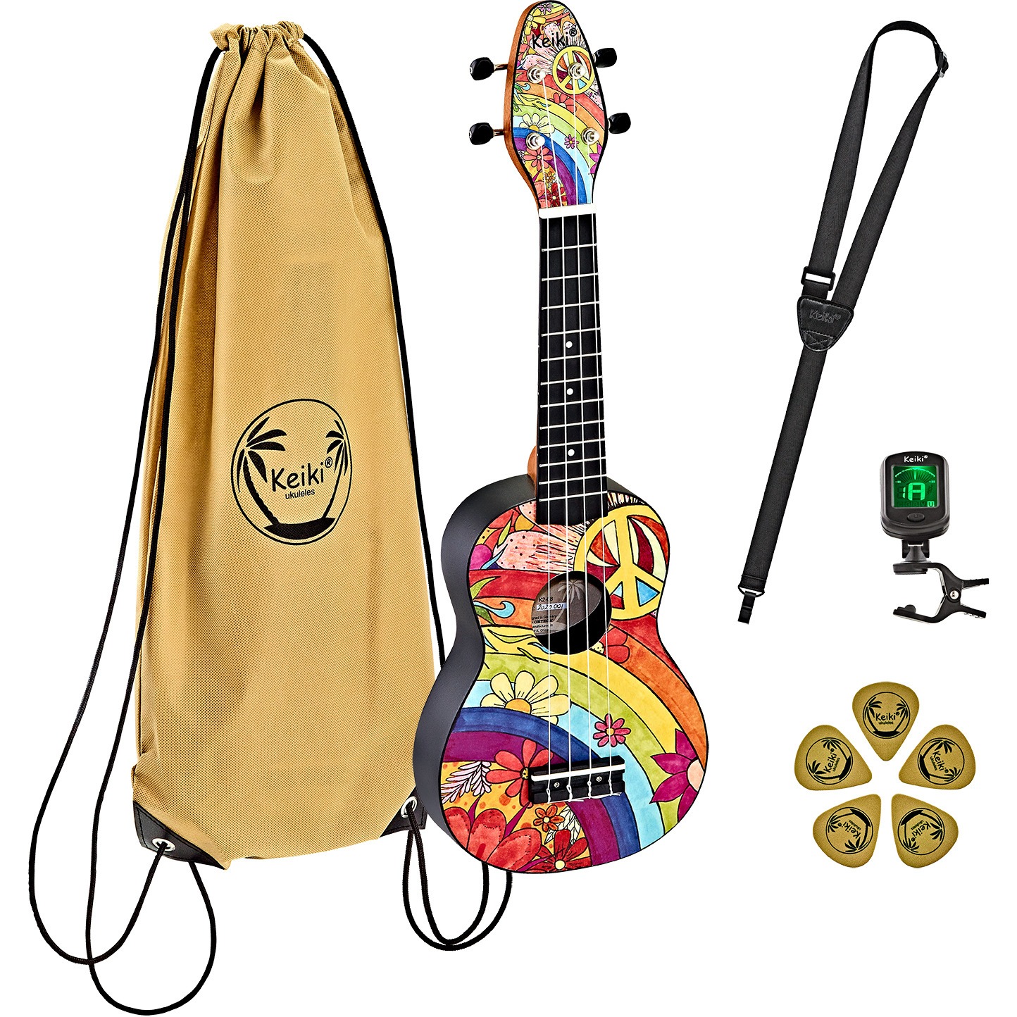 K2-68 - укулеле сопрано от компании Ortega. Верхняя дека укулеле сделана из агатиса, а нижняя дека и обечайки - из прочного пластика ABS. Корпус имеет матовое покрытие. Гриф выполнен из окоуме и имеет накладку из пластика ABS с 12 ладами. Струны укулеле - Aquila UWNY-4-SO. На верхнюю деку нанесен рисунок Peace 68. В комплекте вы получаете чехол, ремень, тюнер и медиаторы.