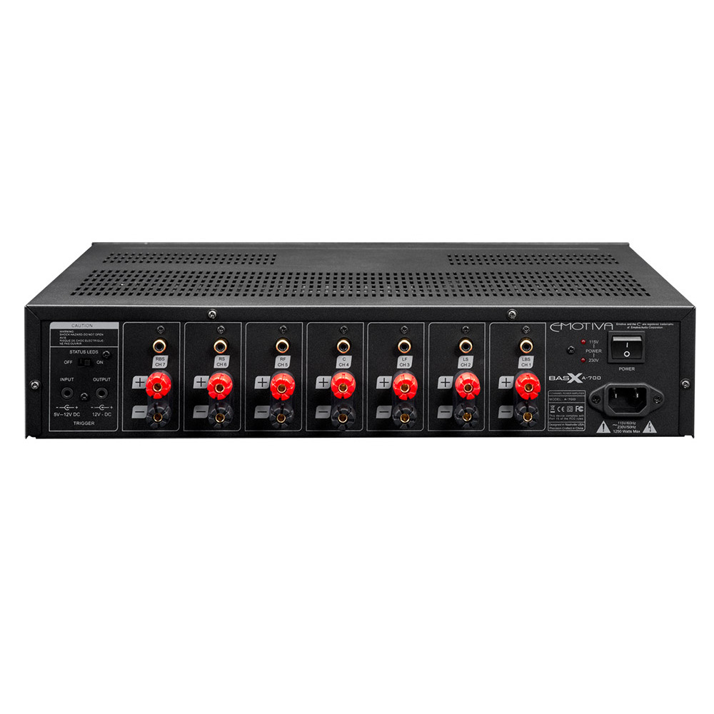 Emotiva A-700 7 канальный усилитель мощности. Мощность при 8 Ом составляет 110 Вт, а при 4 Ом - 210 Вт. Данная модель имеет включение по триггеру, а так же демпинг фактор (8 Ом) 500. Emotiva A-700 выполнена в замечательном черном цвете. Покупая продукты компании Emotiva, вы получаете высококачественный продукт по приемлемой цене.