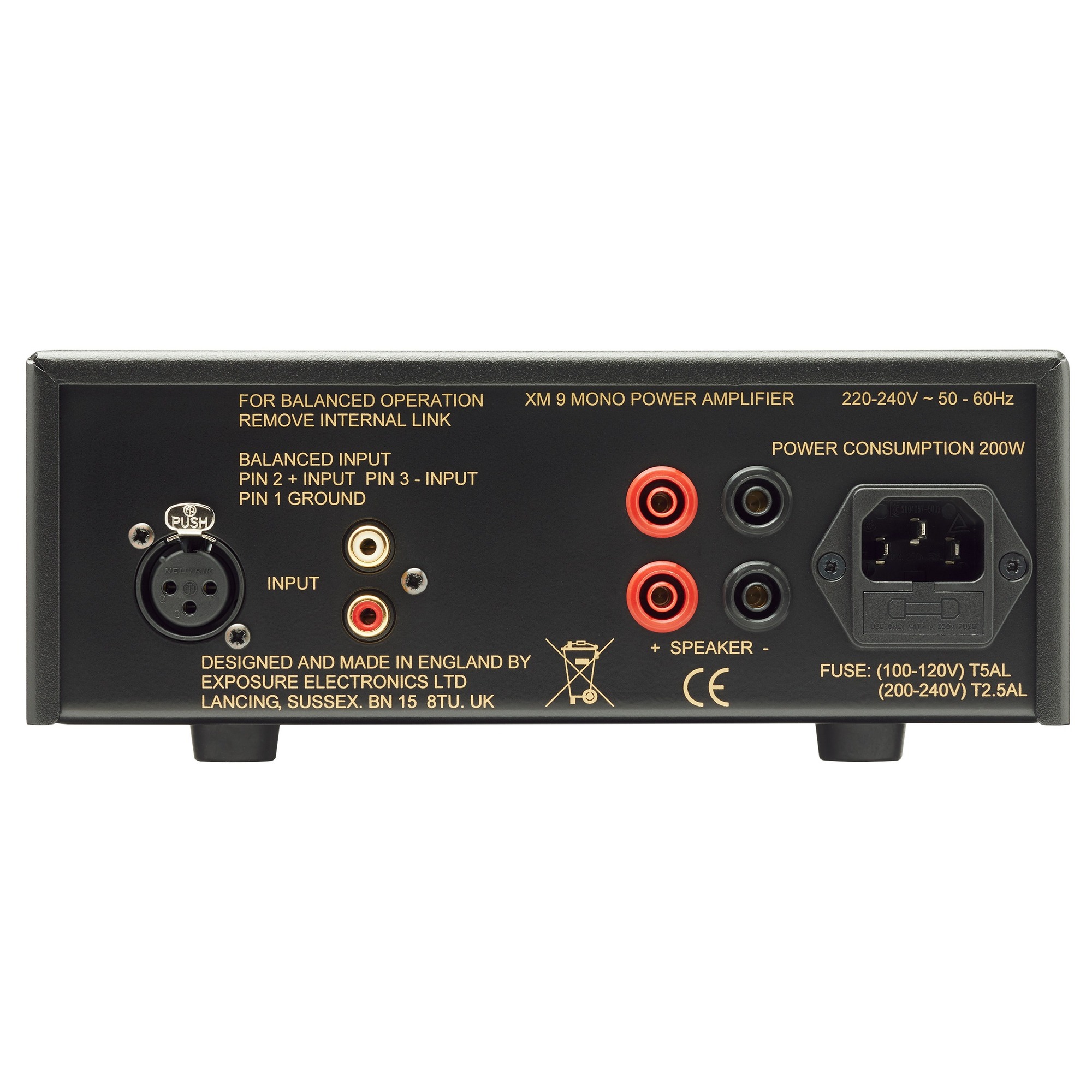 Моноблок Exposure XM9 выдает 2 х 80 Вт на 8 Ом, имеет балансный и небалансный линейные входы (выбираемые перемычкой на плате), а также связь каскадов по постоянному току. Защита от перегрузки по току реализована на отдельной электронной схеме, которая не вносит помех в основной аудио тракт. Высококачественные колоночные клеммы готовы к подключению би-ваерингом.