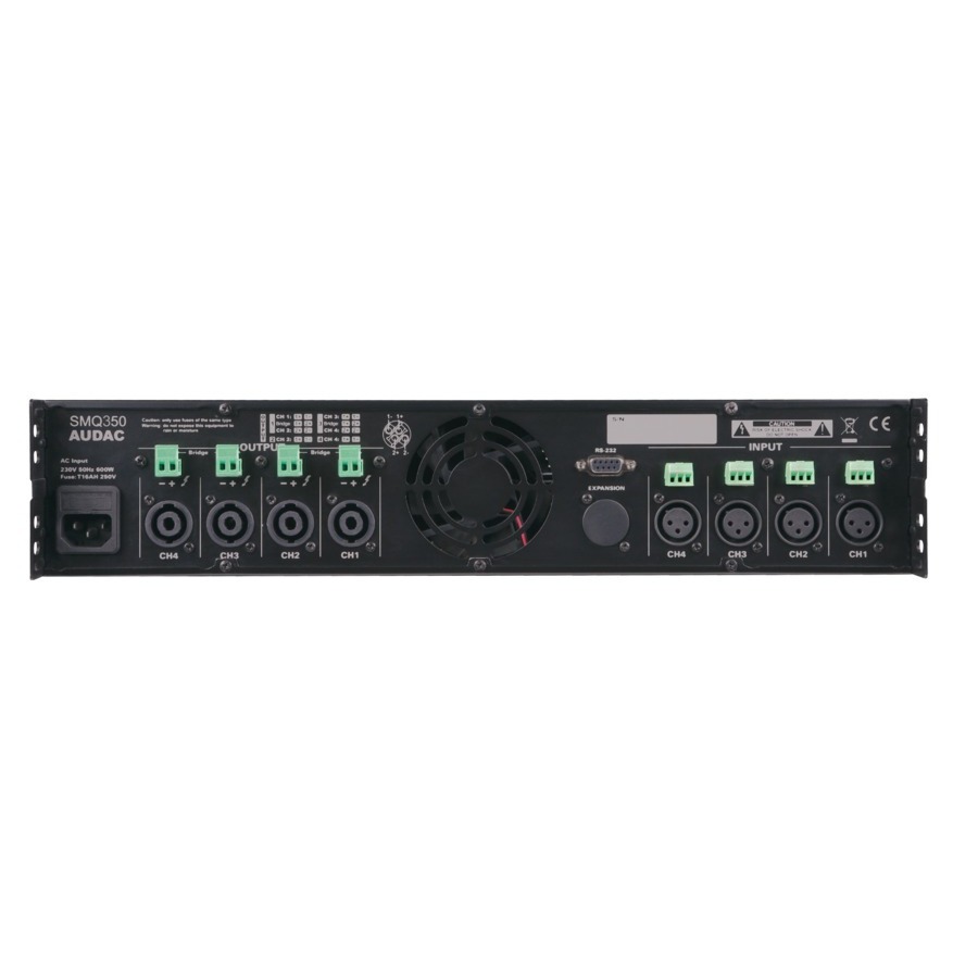 SMQ350 - 4-х канальный усилитель мощности из серии SMA, оснащенный DSP-процессором WaveDynamics и усилительными модулями класса D. Модели серии SMQ представляют собой 4-х канальные версии низкоомных усилителей с различной выходной мощностью, оборудованные DSP-процессорами, позволяющими осуществлять различную цифровую коррекцию сигналов. Цифровая коррекция производится с помощью регулируемых полосовых фильтров различных типов (Линквитц-Рейли, Бессель, Баттерворт) с крутизной 12 - 24 дБ/октаву, а также параметрического 7-полосного эквалайзера. Процессор позволяет также реализовать временную задержку сигнала в разных каналах, устанавливать фиксированную выходную мощность, оптимальную для конкретных моделей акустических систем. Настройки процессора вводятся через USB-порт, расположенный на лицевой панели рядом с 2,5" LCD-дисплеем, и могут быть защищены паролем администратора - возможности пользователя в этом случае ограничены только регулировкой уровня громкости. Для удаленного управления усилителем предусмотрен порт RS-232. Усилитель мощности, оборудованный вентиляторным охлаждением и схемами защиты, в стандартном (4 канала) режиме характеризуется очень невысокими нелинейными искажениями (менее 0,05% на половинной мощности); его можно подключать также в мостовом режиме, получая 2 канала с повышенной выходной мощностью. Применен импульсный блок питания. Корпус высотой 2U выполнен из стали с черным покрытием.