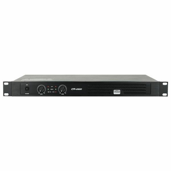 DAP-AUDIO CA-2300 - 2-х канальный цифровой усилитель мощности класса D профессионального уровня в рэковом исполнении. Усилитель рассчитан на эксплуатацию в стерео и мостовом режимах с нагрузкой 2/4/8 Ом. На лицевой поверхности устройства предусмотрены канальные регуляторы уровней сигнала, выключатель и контрольный светодиод электропитания, канальные контрольные светодиоды наличия сигнала, срабатывания лимитера и срабатывания защиты. На тыловой поверхности – входные и выходные разъёмы, разъём электропитания IEC, кнопки переключения режимов и отключения лимитера. Защита усилителя многоуровневая. Кроме лимитера, предусмотрены защита от короткого замыкания, от перегрева, от перегрузки, от постоянного тока на выходах, плавное вкл/выкл. Нормальный тепловой режим прибора поддерживается принудительно, при помощи вентилятора с переменной скоростью вращения. Направление потока воздуха от фронта к тылу. Электропитание предусмотрено от интегрированного импульсного блока питания от стандартной электросети. Рекомендуется монтаж в рэк 19˝ х 1U.