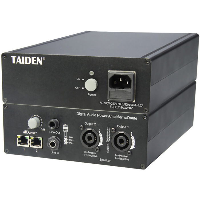 TAIDEN HPA-160D/02 - Цифровой усилитель мощности, 2 x160 Вт (8 Ом), Dante. В одном устройстве компактно совмещен аудио усилитель и переключатель питания. Встроенный веб-сервер для настройки усилителя (эквалайзер и микшер) и отображение статуса микрофона. Защита от короткого замыкания, постоянного тока, перегрева и перегрузки источника питания.