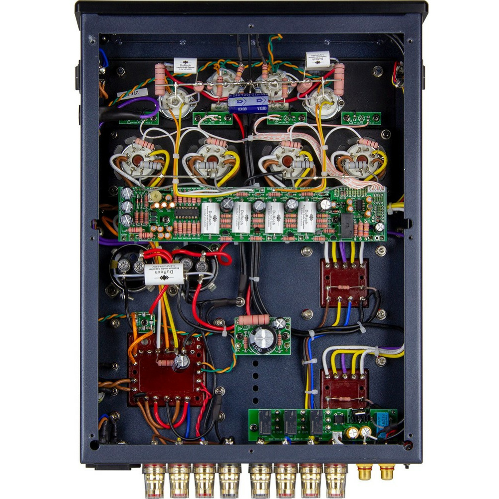 В схеме усилителя используются только отборные компоненты высокого качества, такие как заказные тороидальные силовые трансформаторы в массивных корпусах, широкополосные выходные трансформаторы собственной намотки, керамические ламповые панельки; регулятор уровня громкости от ALPS, конденсаторы от Nichicon, массивные позолоченные колоночные клеммы конструкции WBT (все клеммы фрезерованы из меди и не имеют внутренних полостей – для лучшей проводимости и повышенной надежности); позолоченные входные RCA разъемы на панели.