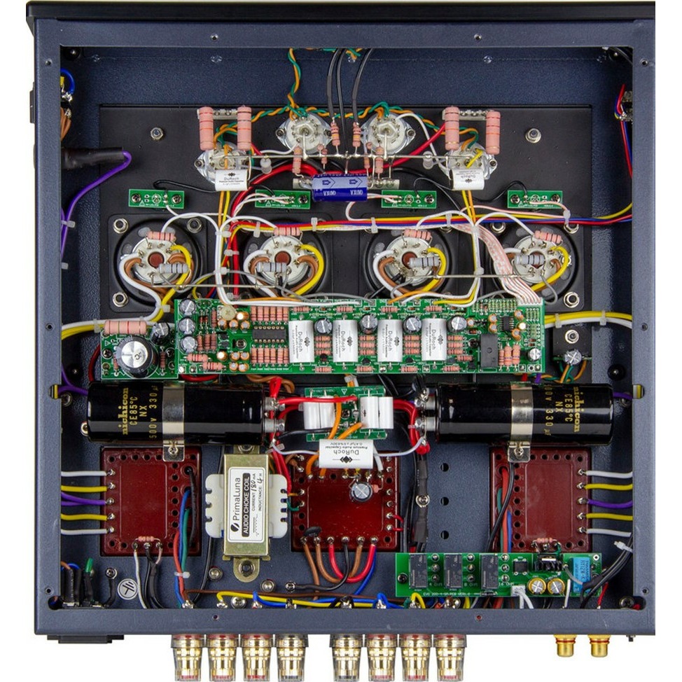 Во всех своих продуктах PrimaLuna использует навесной монтаж с пайкой проводов от точки-к-точке (Point to Point Wiring) и тщательно продуманное расположение компонентов. Весь путь сигнала, включая резисторы и конденсаторы, кропотливо пропаян вручную толстым кабелем мастерами своего дела.