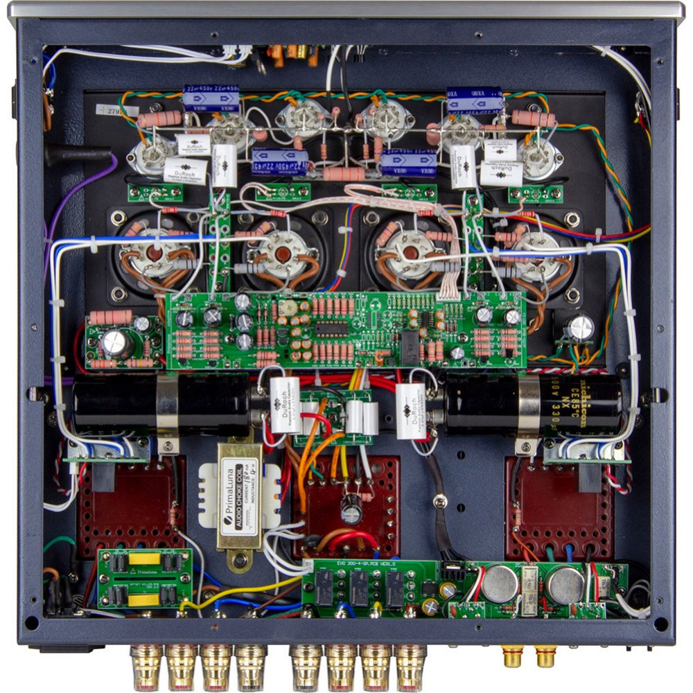 Во всех своих продуктах PrimaLuna использует навесной монтаж с пайкой проводов от точки-к-точке (Point to Point Wiring) и тщательно продуманное расположение компонентов. Весь путь сигнала, включая резисторы и конденсаторы, кропотливо пропаян вручную толстым кабелем мастерами своего дела. В моделях EVO 300 и EVO 400 в критически важном тракте сигнала используются кабели швейцарского производства, с посеребренными проводниками из бескислородной длиннокристаллической меди (OCC), с тефлоновым диэлектриком. Это обеспечивает превосходную скорость обработки сигналов и повышенную ясность звучания.
