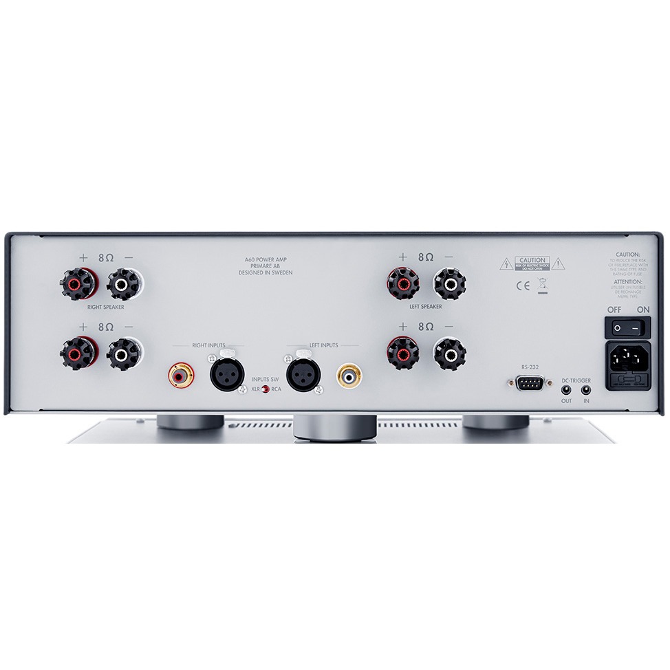 Все для того, чтобы обеспечить необходимую жесткость, и защиту от внешних помех, создаваемых другими компонентами системы. Каждый канал представлен тремя типами входов: небалансные RCA, балансные XLR от Neutrik и высококачественные акустические разъемы WBT Nextgen. Помимо этих входов есть релейный вход и вход для подключения RS232. В Primare А60 установлен мощный импульсный блок питания, который подключен к четырехслойной плате, на которой установлены изготовленные на заказ радиаторы, транзисторы MELF (1%). Все сигнальные дорожки изготовлены по принципу кратчайшего пути, а заземление оптимизировано для обеспечения наилучшего качества воспроизведения. Primare А60 полностью защищен от повреждений постоянным током или перегрева, присутствует система автоматического отключения акустических выходов. Внутренняя разводка до акустических терминалов выполнена кабелем Van Den Hul SCS12. Работа технологии UFPD (сверхбыстрый источник питания) была оптимизирована благодаря многократным прослушиваниям и подбору качественных компонентов.