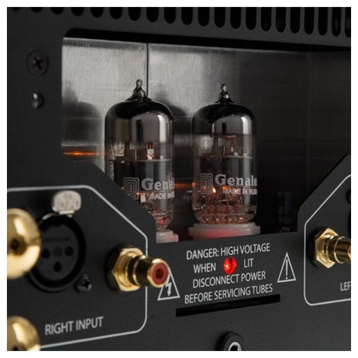 Входные каскады усилителя построены на лампах российского производства Gold Lion 6922, которые вручную отобраны в пары. Эти триоды работают в режиме с постоянным смещением и питаются высоким анодным напряжением, что обеспечивает широкий динамический и частотный диапазоны. Схема предусилителя не имеет отрицательной обратной связи для исключения возникновения фазовых искажений. Такой входной каскад обеспечивает отличное согласование с любым источником сигнала, будь то аналоговый пред или современный ЦАП с собственной регулировкой громкости. Усилитель оснащен балансными и небалансными входами.