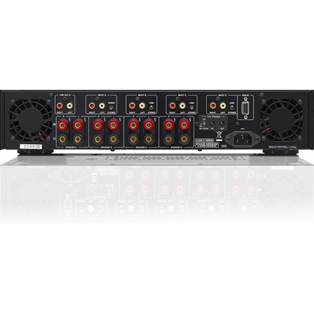 RKB-8100 может связывать все входы с входом A на задней панели, что позволяет перенаправить аналоговый или цифровой сигнал с входа A на три остальных канала без прокладки дополнительных проводов и затрат времени. Аналоговый вход A можно также просуммировать и превратить в моно, что дает два канала в режиме stereo-to-mono на выходе. Если же вход A установлен в режим моно и одновременно используется связывание каналов, то во всех 8 каналах будет один и тот же моно сигнал – что идеально подходит для озвучивания больших площадей, где обычное стерео нежелательно, например для ландшафтного или коммерческого применения. Порт RS232 на задней панели обеспечивает соединение усилителей с системой автоматизации – для сигналов управления и обратной связи.