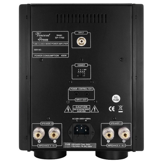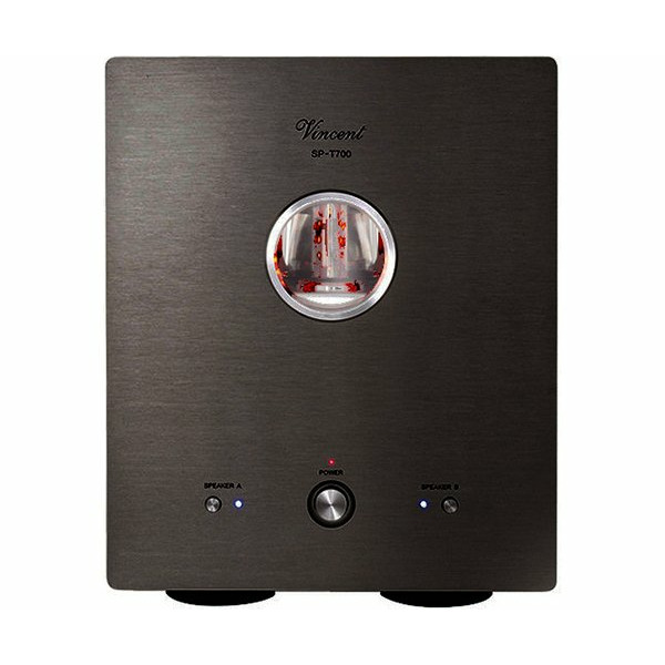 Vincent SP-T700 - это усилитель мощности моно гибридный, мощность 300 Вт (на канал), усилитель класса А, отношение сигнал/шум 90 дБ, вес 16 кг.