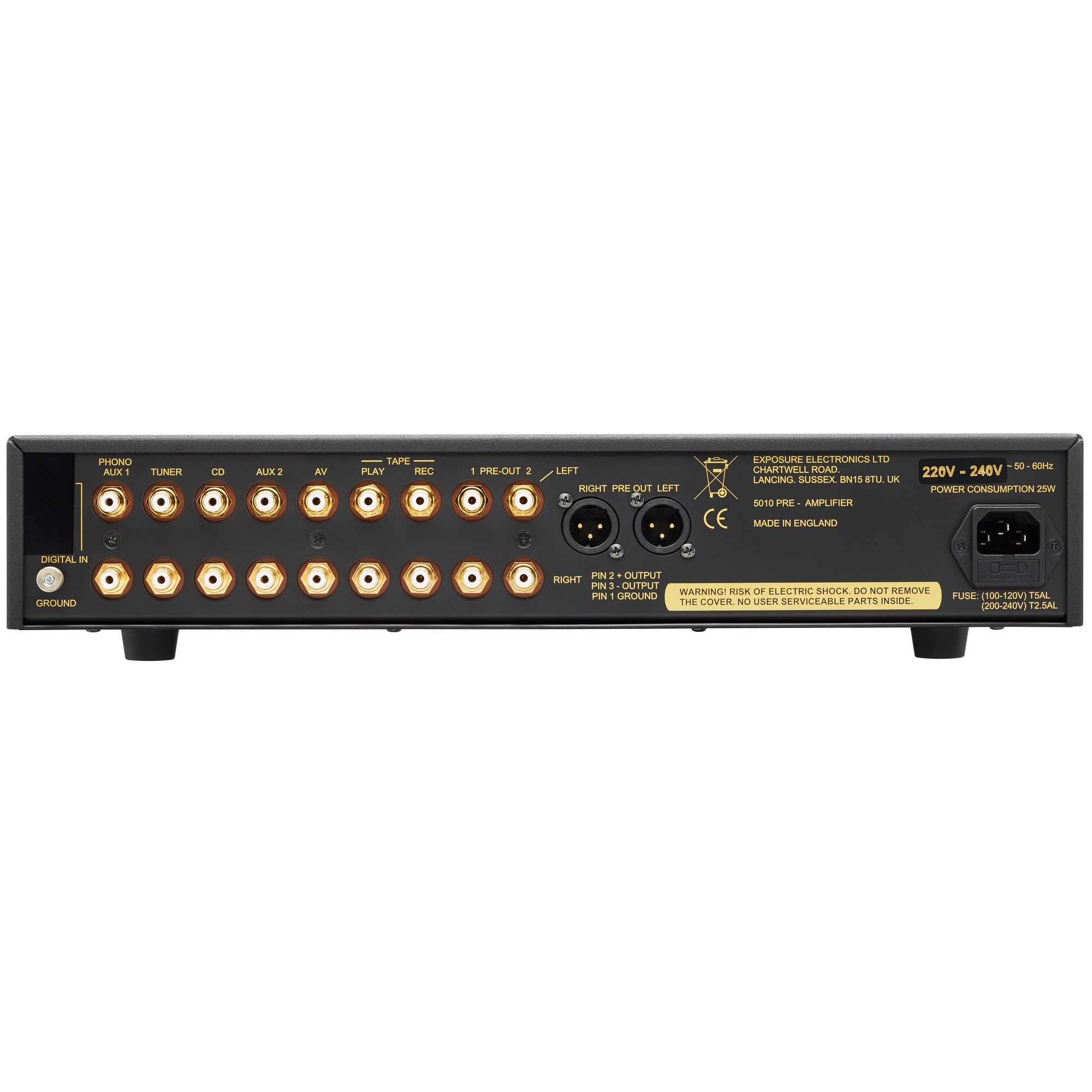 У Exposure 5010 имеется 6 линейных входов или 5 плюс вход опционной платы фонокорректора, 2 выхода main out (RCA), 1 выход на XLR и 1 выход TAPE на запись. Выходные буферные схемы на отдельных транзисторах работают в чистом классе А, а балансный выход работает со связью по постоянному току.