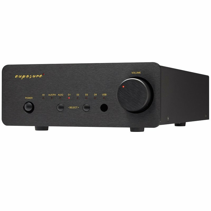 У Exposure XM7 имеется вход для MM головок звукоснимателей, и два гнезда для наушников – на 3.5 мм и 1/4" (6.3 мм), которые выбираются переключателем на задней панели. Кроме этого, на задней панели еще есть линейный вход и AV вход с фиксированным уровнем сигнала. Для цифровых сигналов предусмотрены два коаксиальных и два оптических входа, а также порт USB class 2 с возможностью приема сигналов DSD. Две пары выходов предусилителя предназначены для подключения колонок би-ампингом или для активного сабвуфера.