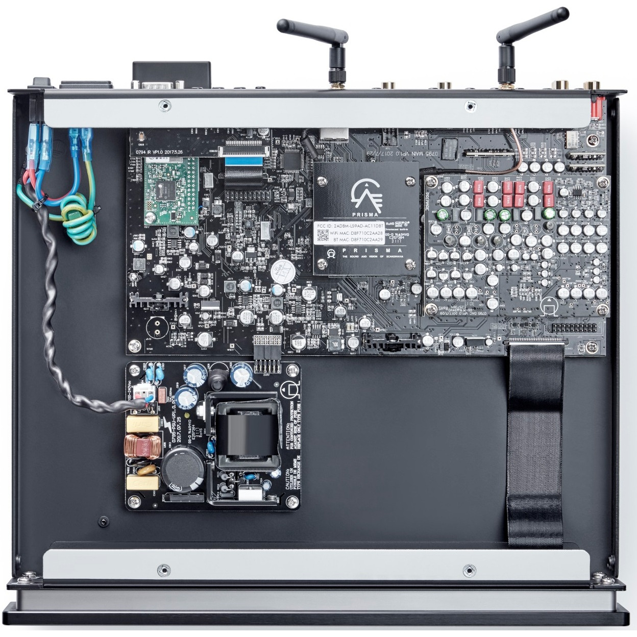 Усилитель воспроизводит звук в диапазоне частот от 20 Гц до 20000 Гц с коэффициентом гармонических искажений <0,05% и соотношением s/n 90 дБ. Стример поддерживает потоковое воспроизведение современных аудио форматов, включая MP3, WAV, WMA, OGG, MP4 (AAC), LPCM, AIFF, FLAC, ALAC, DSD и потоковые протоколы DLNA/UPnP, Spotify Connect, Chromecast, WiSA и др. Связь, передача данных и управление воспроизведением осуществляется по Bluetooth, AirPlay, Wi-Fi и Ethernet. Входы на задней панели: коаксиальный S/PDIF (RCA), линейный RCA, аналоговый 3.5 мм, 3.5 мм IR, три оптических Toslink и цифровые RS232, USB тип A и тип B. Входы на задней панели представлены рядом: коаксиальный S/PDIF (RCA), аналоговое аудио RCA, 3.5 мм и триггер, 3.5 мм IR. В комплекте – пульт дистанционного управления C25.