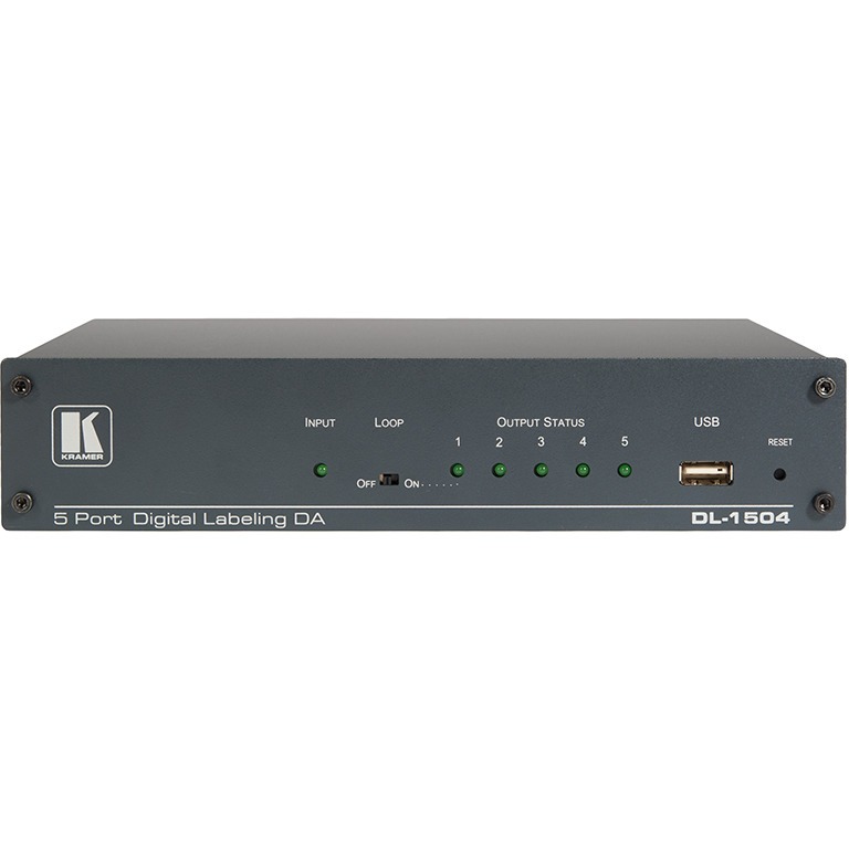 DL-1504 – усилитель-распределитель 1:5 сигнала HDMI разрешением 4K60 (4:2:0) c функцией наложения изображения поверх живого видео. Использует технологию Digital Labeling, которая позволяет накладывать на видеосигнал статичные или анимированные изображения (логотипы, надписи и т.д.), настраивать их прозрачность, перемещать по экрану и др. На каждом выходе накладывается отдельное, независимое от других изображение, которое хранится в отдельной от других области внутренней памяти. Изображения загружаются по Ethernet или через порт USB. Управление и настройка – по Ethernet через ПО VCO Setup (для Windows).
