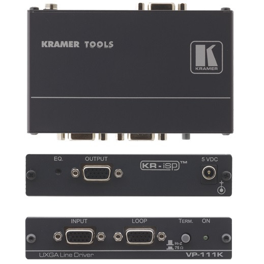 Kramer VP-111K - 1: 1 Компьютерная графика Видео усилитель Линия, что компенсирует потери сигнала (сигналы превышения UXGA, 1600 х 1200 пикселей) в длинных кабелей. Усилитель линия применяется для двух мониторов и презентационных системах, а также для дистанционной передачи и кабеля выравнивания. КР-провайдер Передовая технология обработки синхронизации, которая может быть включена или отключена, восстанавливает синхронизации сигнала сигнала и обеспечивает совместимость со множеством компьютеров (даже при низком уровне синхронизации). Усилитель имеет 1 вход XGA и выход на разъеме HD 15-контактный и совместим с HDTV компонентных видеосигналов с использованием многожильного кабеля (Крамер CGM / 3RVF). S / N соотношение 75dB означает четкие сигналы без каких-либо зернистой видео шума. Пропускная способность 500 МГц на -3 дБ обеспечивает прозрачность даже при самом высоком разрешении. Эквалайзер триммер регулирует уровень коррекции компенсации кабель для выхода. Дополнительный РК-3T подставка адаптер позволяет 3 единицы будут установлены бок-о-бок в 1U стоечного пространства.