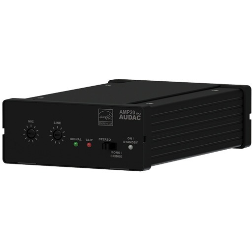 Audac AMP20MK2 - двухканальный усилитель мощности класса D, имеется один вход для балансных стереофонических аудиосигналов и один для балансного микрофонного сигнала, два выходных канала мощностью по 15 Вт (при нагрузке 4 Ом) или один мощностью до 30 Вт в мостовом режиме. Управление осуществляется посредством внешних контроллеров, настенных микшеров и регуляторов громкости.