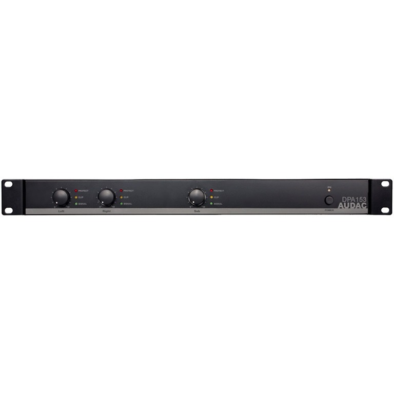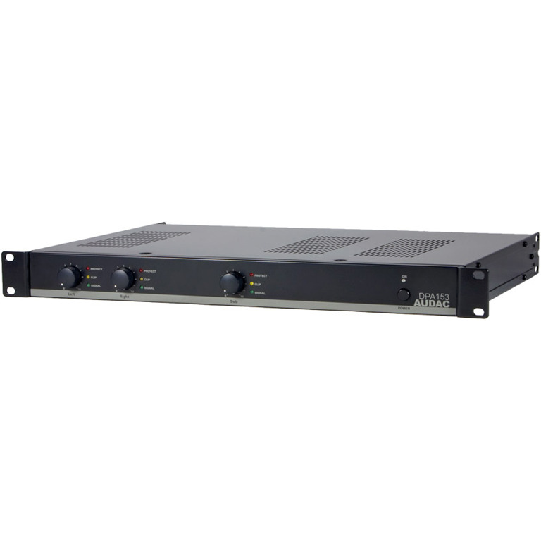 DPA153 – трехканальный усилитель мощности класса D, предназначенный для монтажа в рэковую стойку. Усилители серии DPA выпускаются в 2-х канальных и многоканальных вариантах; все модели имеют стандартную ширину 19'' и высоту 1U. Модель DPA153 – трехканальный усилитель, предназначенный для трифонического подключения пары акустических систем и пассивного сабвуфера, для которого в усилителе предусмотрен специальный, более мощный канал. Фактически, усилитель является трехканальным по числу выходных каскадов усиления, но сигнал для НЧ-канала суммируется и отфильтровывается из левого и правого каналов. Номинальная мощность стереоканалов составляет 2х150 Вт (4 Ом) или 2х80 Вт на 8 Ом, номинальная мощность канала сабвуфера – 300 Вт RMS. В мостовом режиме развиваемая мощность (2 канала) составляет 300 Вт. В усилителе применен эффективный импульсный источник питания и пассивное конвекционное охлаждение. Предусмотрены схемы защиты от короткого замыкания, перегрева, перегрузки и постоянной составляющей. Коммутация реализована на разъемах XLR 3 pin – линейные балансные входы (XLR female) и линейные балансные выходы (XLR male). Выбор типа подключения нагрузки (стерео, мост) осуществляется переключателем на тыльной панели усилителя. Подключение к акустическим системам производится через клеммные колодки. На фронтальной панели расположены индикаторы состояния сигнала и регуляторы уровня громкости каждого канала.