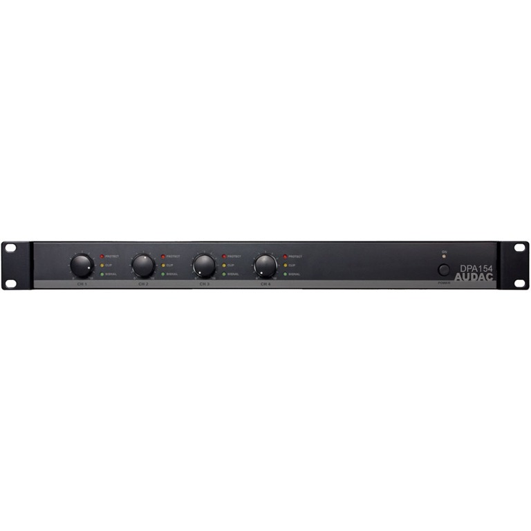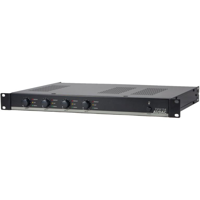 DPA154 – 4-х канальный усилитель мощности класса D, предназначенный для монтажа в рэковую стойку. Усилители серии DPA выпускаются в 2-х канальных и многоканальных вариантах; все модели имеют стандартную ширину 19'' и высоту 1U. Модель DPA154 – самый мощный многоканальный усилитель модельного ряда. Это четырехканальный усилитель с номинальной мощностью 4х150 Вт (4 Ом) или 4х80 Вт на стандартной нагрузке 8 Ом. В мостовом режиме развиваемая мощность составляет 2х300 Вт. В остальных аспектах флагманский усилитель ничем не отличается от менее мощных моделей. В DPA154 применен эффективный импульсный источник питания и пассивное конвекционное охлаждение. Предусмотрены схемы защиты от короткого замыкания, перегрева, перегрузки и постоянной составляющей. Коммутация реализована на разъемах XLR 3 pin – линейные балансные входы (XLR female). Линейные выходы в 4-х канальных моделях DPA не предусмотрены. Выбор типа подключения нагрузки (стерео, мост) осуществляется переключателем на тыльной панели усилителя. Подключение к акустическим системам производится через клеммные колодки. На фронтальной панели расположены индикаторы состояния сигнала и регуляторы уровня громкости каждого канала.