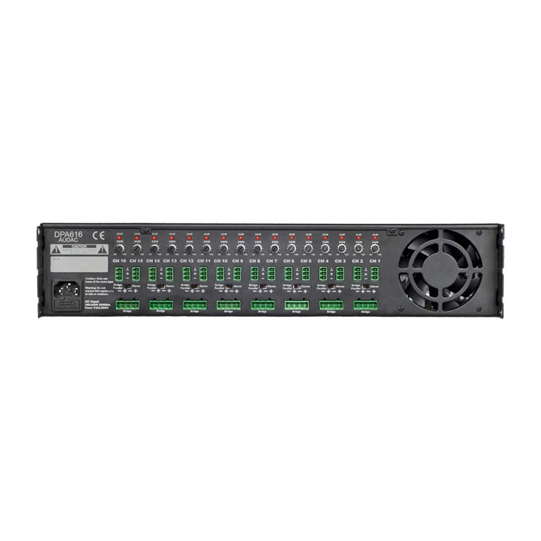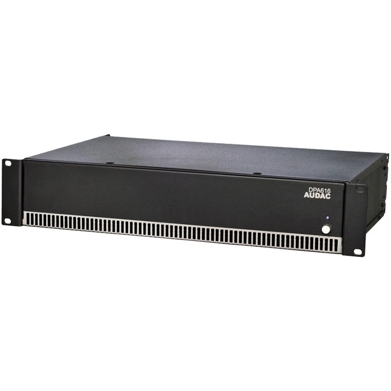 DPA616 – 16-канальный усилитель мощности класса D. Максимальная мощность: 60 Вт/канал при нагрузке 4 Ом. В мостовом режиме: 120 Вт/канал при нагрузке 8 Ом. Уровень сигнала на каждом канале регулируется отдельным потенциометром. Присутствует система защиты, предотвращающая короткое замыкание, перегрев и перегрузку. Отлично подходит для работы с многозонными системами распределения аудиосигналов на 8-16 зон. Оборудован только необходимыми разъемами и средствами управления. Прост в установке и использовании. Входные порты устройства используют 3-контактные клеммные блоки, которые позволяют подключать источники как небалансных, так и балансных аудиосигналов линейного уровня. Уровень сигнала на каждом канале регулируется отдельным потенциометром. Каждая пара входных портов также оснащена переключателем Stereo / Bridge & Parallel (Стереорежим / Мостовой или параллельный режимы). Выходные порты используют 4-контактные клеммные блоки. В усилителе предусмотрена дополнительная система защиты, предотвращающая короткое замыкание, перегрев и перегрузку. В случае необходимости усилитель автоматически ограничивает максимальный уровень сигнала. Возможна установка в 19″ стойку (2U). Устройства Audac серии DPA сочетают в себе наилучшие свойства, выдающееся качество звука и все другие известные преимущества усилителей класса D. Среди них эффективность и очень малое тепловыделение. Благодаря корпусу с пассивным охлаждением устройства требуют минимального обслуживания при обеспечении максимальной надежности. Малый размер делает устройства серии удобными как для монтажа в стационарные стойки, так и для мобильных применений.