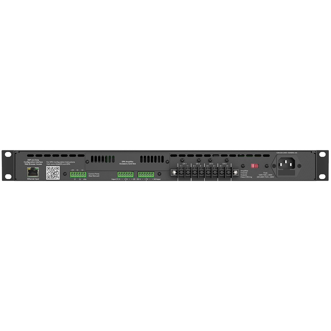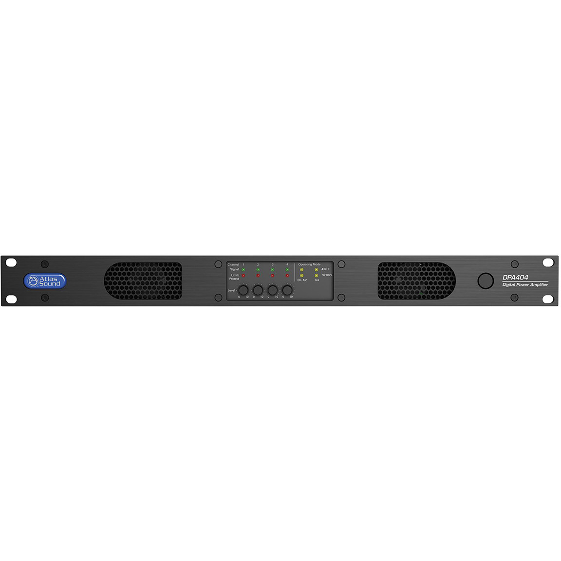 DPA404 – четырехканальный усилитель мощности с цифровым сигнальным процессором и балансными входами, 4x50 Вт – 4 Ом, 4x75 Вт – 8 Ом, 4х100 Вт – 70/100 В, 2х100 Вт – 70/100 В + 2х50 Вт – 4 Ом, 4х100 Вт – 70/100 В, 2х100 Вт – 70/100 В + 2х75 Вт – 8 Ом. Управление и мониторинг состояния усилителя осуществляется по сети Ethernet. Высота 1U.