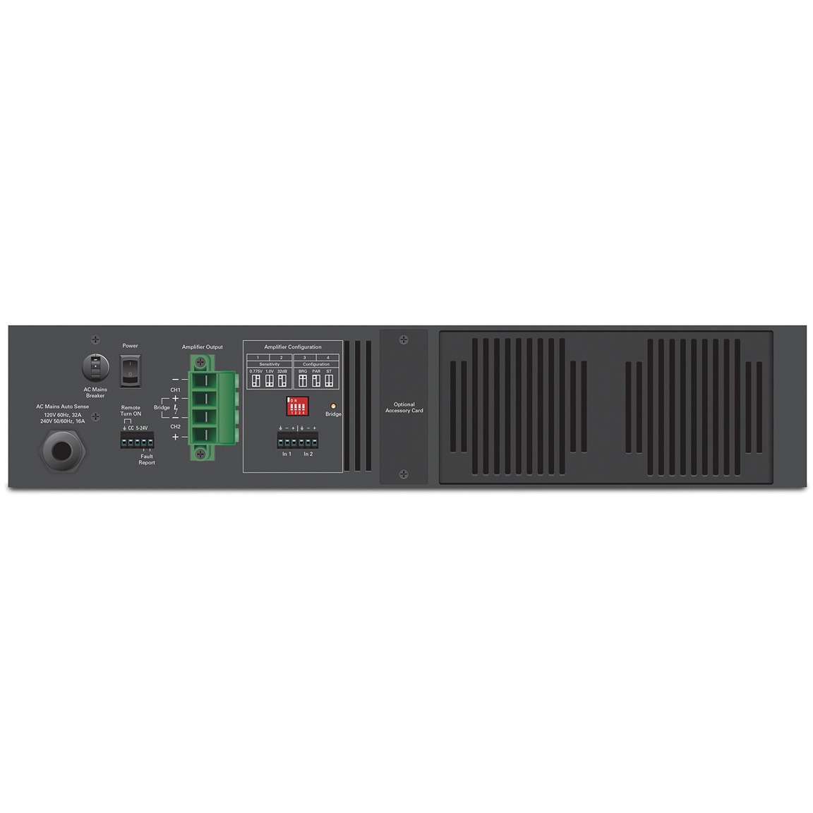 HPA4202 – двухканальный усилитель мощности. 2х2100 Вт – 70 В, 2х1200 Вт – 8 Ом, 2х2100 Вт – 4 Ом, 2х2500 Вт – 2 Ом, 1х3200 Вт – 8 Ом, 1х4800Вт – 4 Ом. Удаленное включение, опциональная карта Dante. Высота 2U.