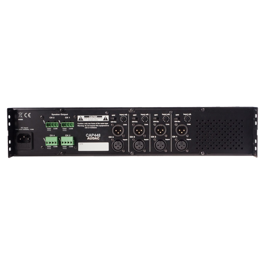 CAP448 – четырехканальный трансляционный усилитель мощности балансных аудиосигналов, выходная мощность на канал составляет 480 Вт, предназначен для использования в системах с напряжением линии 100 В. Отлично подходит для работы с системой распределения аудиосигналов на четыре зоны. Оборудован только необходимыми разъемами и средствами управления. Прост в установке и использовании. Устройства Audac серии CAP сочетают в себе наилучшие свойства, выдающееся качество звука и все другие известные преимущества усилителей класса D. Оборудован тихой автоматической системой воздушного охлаждения. Оборудован системой защиты от короткого замыкания, перегрузки и перегрева, имеет ограничитель уровня сигнала. Подключение источника сигнала осуществляется с помощью разъемов XLR, для каждого канала предусмотрен проходной порт. Также каждый канал оборудован регулятором уровня и отключаемым фильтром низких частот (400 Гц). Подключение акустических систем осуществляется через клеммные блоки. Усилитель может быть установлен в 19″ монтажную стойку (высота 2U).