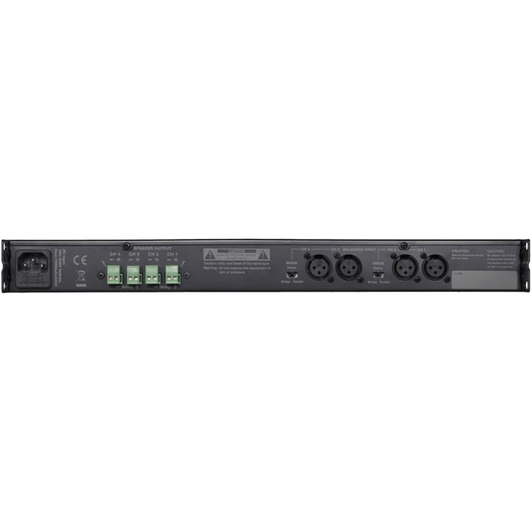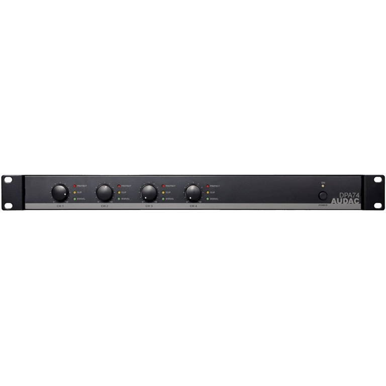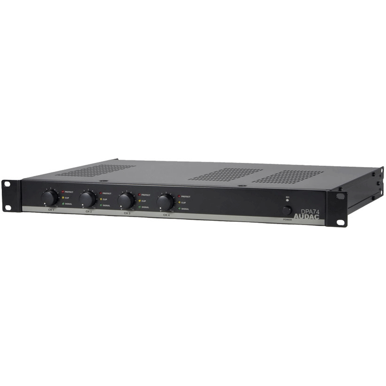 DPA74 – 4-х канальный усилитель мощности класса D, предназначенный для монтажа в рэковую стойку. Усилители серии DPA выпускаются в 2-х канальных и многоканальных вариантах; все модели имеют стандартную ширину 19'' и высоту 1U. Модель DPA74 – четырехканальный усилитель с номинальной мощностью 4х75 Вт (4 Ом) или 4х50 Вт на стандартной нагрузке 8 Ом. В мостовом режиме развиваемая мощность составляет 2х150 Вт. В усилителе применен эффективный импульсный источник питания и пассивное конвекционное охлаждение. Предусмотрены схемы защиты от короткого замыкания, перегрева, перегрузки и постоянной составляющей. Коммутация реализована на разъемах XLR 3 pin – линейные балансные входы (XLR female). Линейные выходы в данной модели не предусмотрены. Выбор типа подключения нагрузки (стерео, мост) осуществляется переключателем на тыльной панели усилителя. Подключение к акустическим системам производится через клеммные колодки. На фронтальной панели расположены индикаторы состояния сигнала и регуляторы уровня громкости каждого канала.