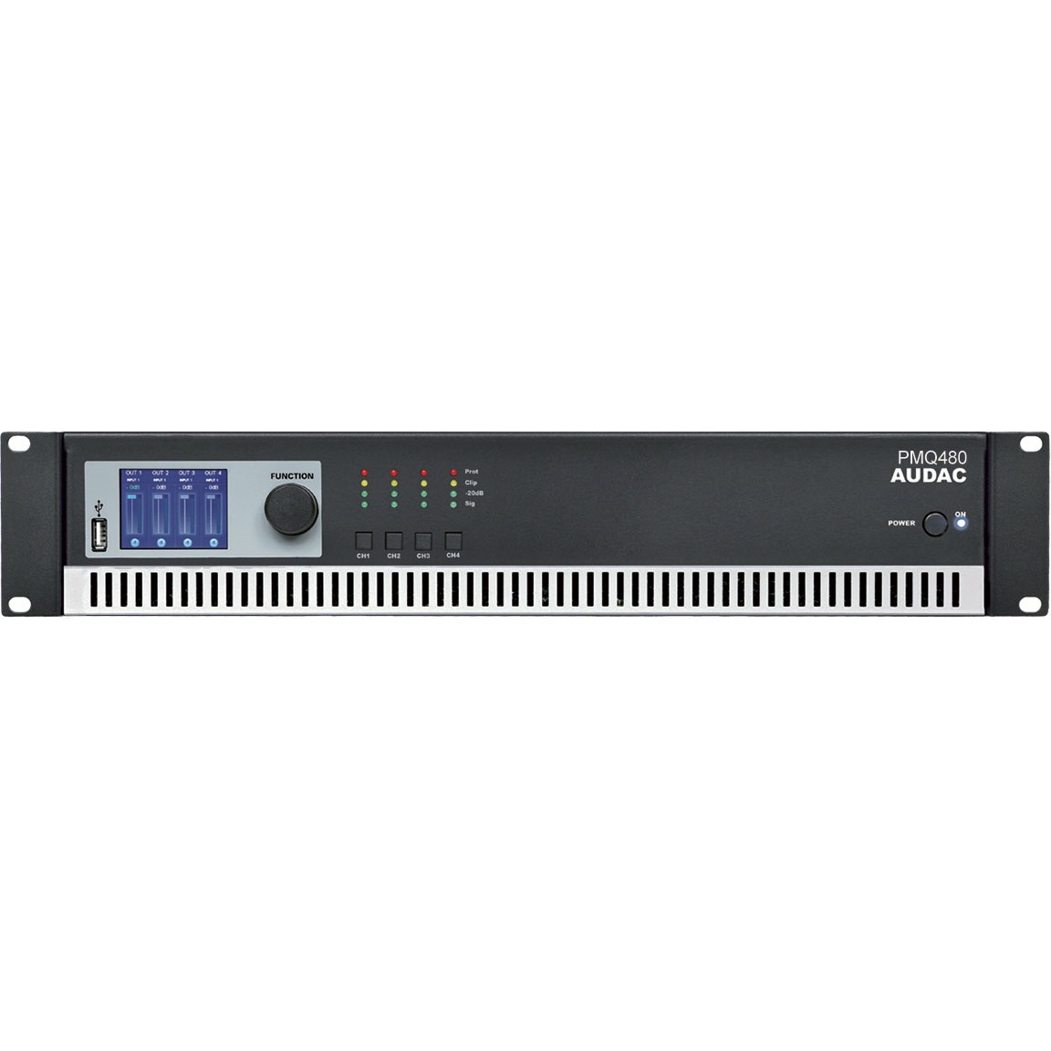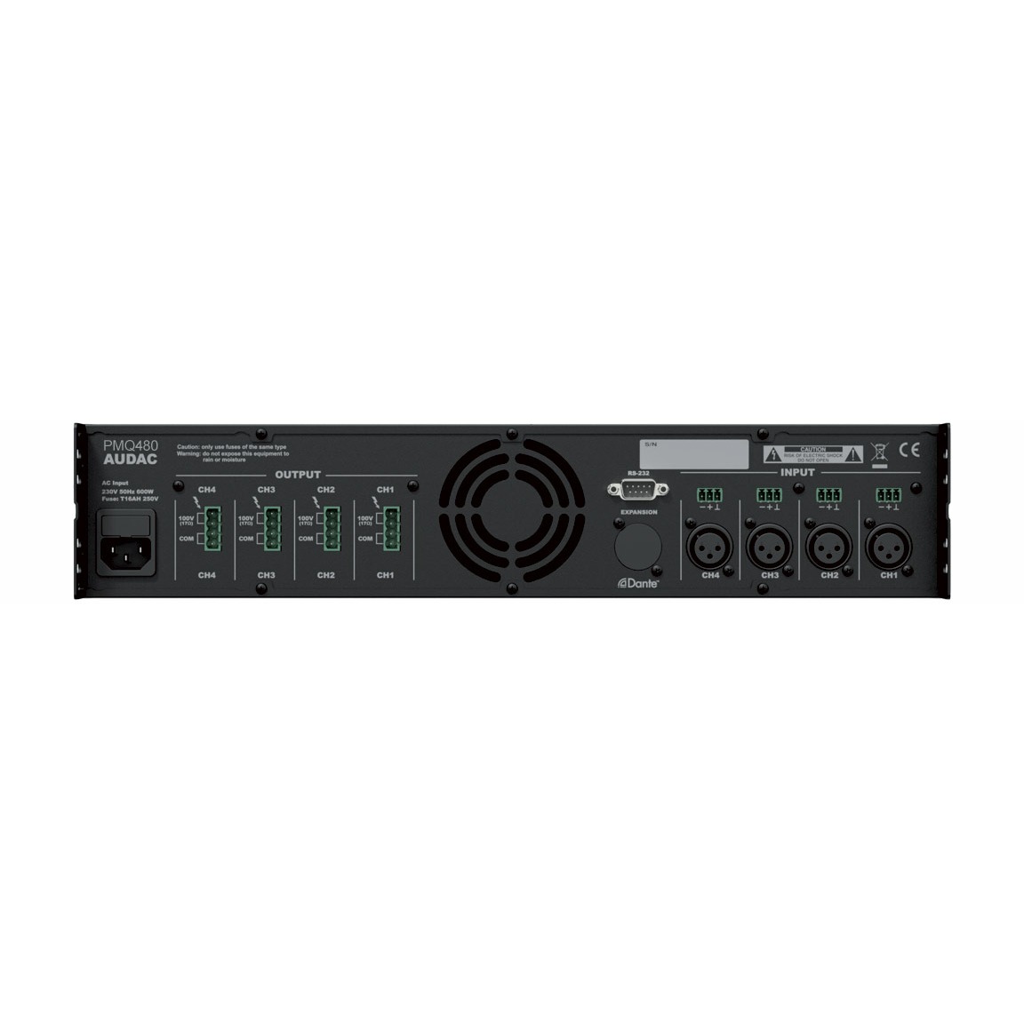 PMQ600 – 4-канальный усилитель мощности, оснащенный DSP-процессором и усилительными модулями класса D. Выходная мощность 600 Вт RMS на канал (100 В). Цифровые фильтры, параметрический 7-полосный эквалайзер, временная задержка сигнала, фиксированная выходная мощность, схемы защиты выхода. Загрузка настроек DSP через USB, управление через RS-232. Опционально поставляется 4-канальная карта Dante. Усилитель имеет стальной корпус высотой 2U в рэковом исполнении.