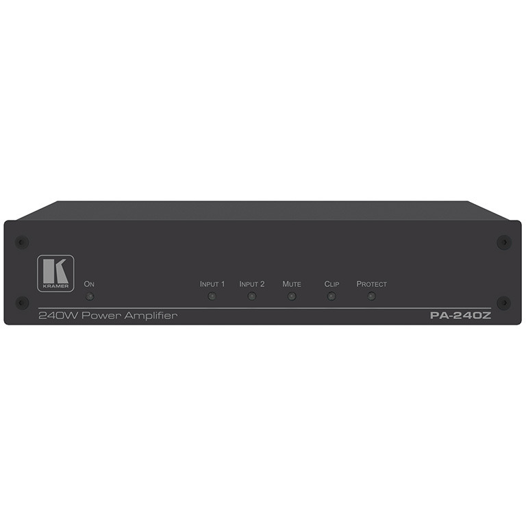 PA-240Z – усилитель мощности с трехполосным эквалайзером и ВЧ-фильтром, защитой от перегрева и короткого замыкания. Мощность усилителя 2x120 Вт при нагрузке 4 Ом/8 Ом, 240 Вт при подключении по 70/100 В. Усилитель имеет балансные и небалансные входы. Управление и мониторинг состояния осуществляется по RS-232 или сети Ethernet (web-интерфейс).