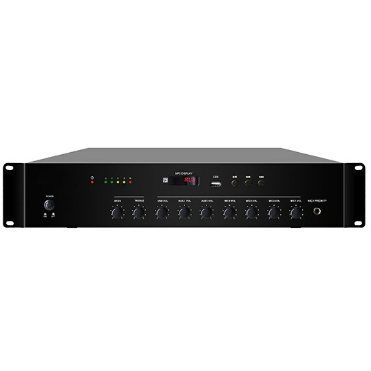 Трансляционный усилитель мощностью 60Вт со встроенным с USB-плеером для воспроизведения MP3. Он предназначен для работы с акустическими системами с высоким импедансом (100 В). 5-сегментная светодиодная индикация для контроля уровня выходного сигнала. Устанавливается в стандартный 19" рэк 2U.
