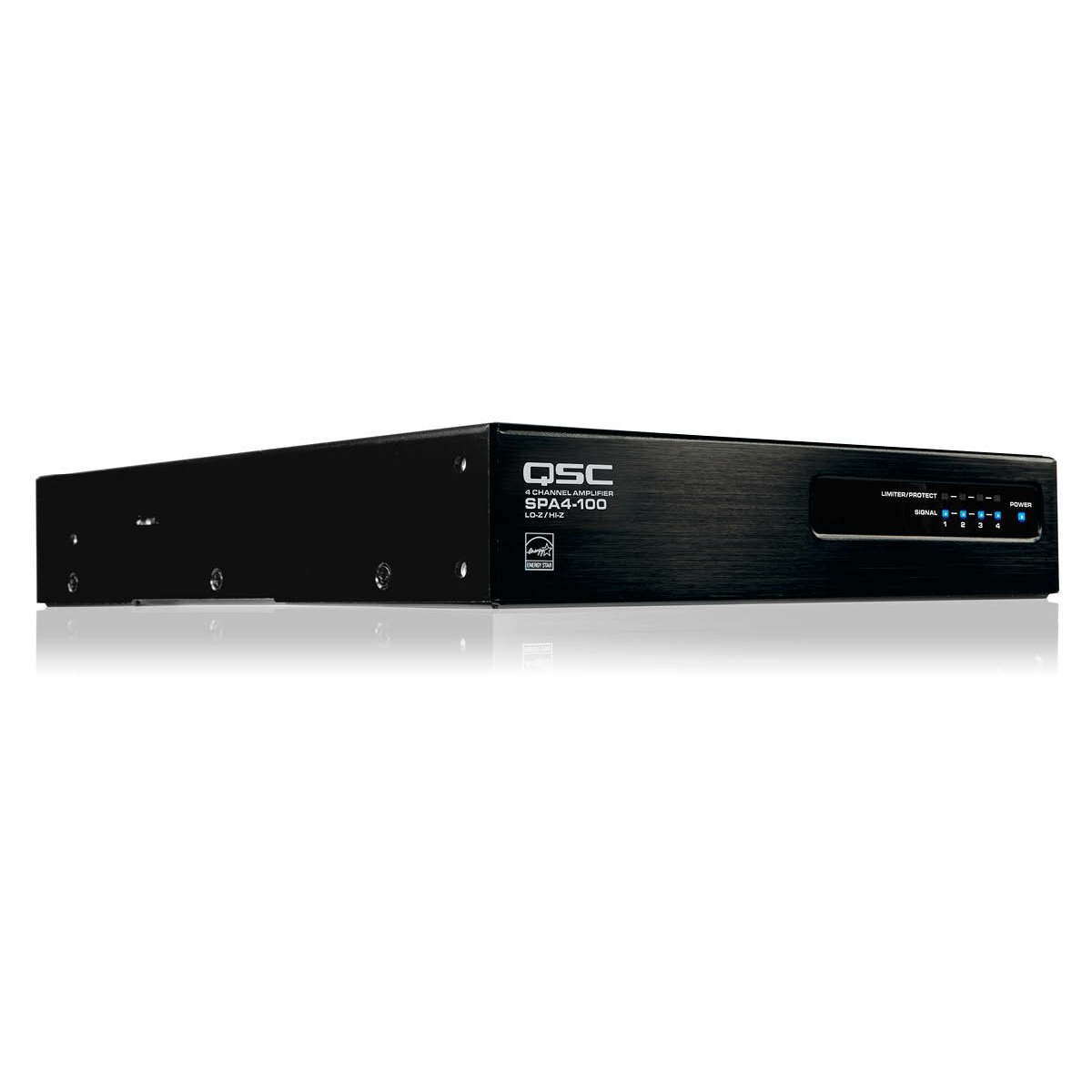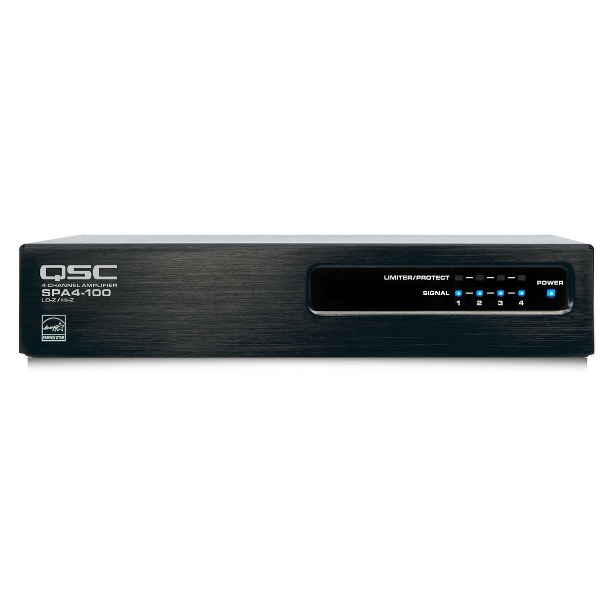 QSC SPA4-100 – профессиональный четырёхканальный рэковый усилитель мощности класса D серии SPA высотой 1U с полурэковым размещением. Он обеспечивает высокий уровень звука для профессиональных АС и может быть использован в турах, при озвучивании концертов, в постоянных и временных инсталляциях. Полная выходная мощность составляет 100 Вт/канал в стереорежиме с нагрузкой 4 или 8 Ом до 200 Вт в мостовом режиме. Тыловая панель предоставляет доступ к основным регулировкам уровня выходного сигнала раздельно на всех каналах, на фронтальной панели располагаются светодиоды наличия сигнала и включения лимитера, также отдельные для каждого канала. На тыловой панели QSC SPA4-100 также расположены входные и выходные разъемы на Euroblock. Также там можно найти два двойных разъема Remote для управления по сети и мониторинга (по одному разъему на каждую пару каналов + заземление) и набор DIP-переключателей, управляющих работой ВЧ-фильтра и режимами вообще. В целом данный усилитель представляет собой идеальный выбор для мобильного, турового и концертного применения, он обеспечивает высокую мощность выходного сигнала, сохраняя при этом малый вес и отличную функциональность.