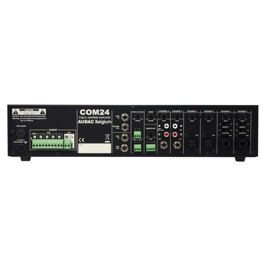 COM24 - усилитель для систем громкой связи с выходной мощностью до 240 Вт, имеет большое разнообразие опций для всех видов подключений, таких как два несимметричных линейных стерео входа, которые могут переключаться по уровню с линейного на микрофонный (Mic / Line), 2 симметричных входа Mic / Line, а также два симметричных входа Mic / Line level с настройкой приоритета и фантомным питанием. Усилитель COM24 имеет 5 высокоимпедансных 100 В моно выходных зон и одну низкоимпедансную 4 Ом выходную зону. Другими интересными особенностями устройства являются коммутируемые входы и выходы, вход с усилителя и выход на предварительный усилитель, интегрированный сигнальный модуль, а также возможность подключения телефонного пейджерного блока. Усилитель оборудован прогрессивной схемой защиты, защищающей от замыканий по постоянному току, перегрева, перегрузки и при необходимости ограничивает сигнал. Все органы управления: выбор каналов и регуляторы уровня, двухполосный регулятор тембра, мастер-регулятор громкости и индикаторы (светодиодный индикатор усредненной громкости и светодиоды перегрузки), расположены на передней панели усилителя. Усилители серии COM - легкие в использовании, они универсальны и многофункциональны, имеют современный дизайн и оборудованы всеми необходимыми органами управления и коммутационными возможностями.