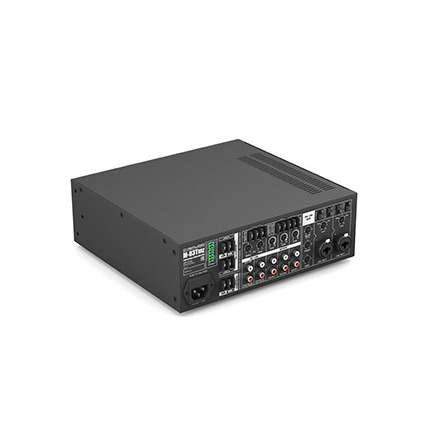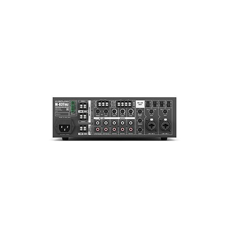 CVGaudio M-83Tmz – это профессиональный трансляционный микшер–усилитель, рассчитанный на 2 зоны оповещения, со встроенным MP3/FM/Bluetooth модулем. На передней панели предусмотрена индивидуальная настройка громкости для обеих зон вместе с селекторами, на задней - регуляторы входной чувствительности и эквалайзер для микрофонного, линейного и AUX входов, и регулировка уровня суммарной громкости микрофонных входов, а также источника звука. Дополнительно на задней панели предусмотрена функция активации приоритетности микрофонных входов, переключатель фантомного питания (+24В) для подключения конденсаторных микрофонов, а также сухие контакты EXT FULL MUTE и EXT MUSIC MUTE для интеграции усилителя в систему пожарного оповещения.