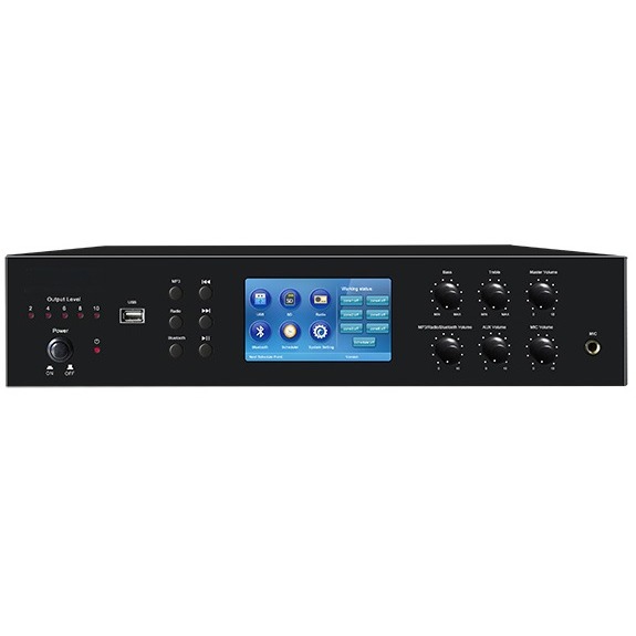 LAMT6250 - это 6-зонный трансляционный усилитель, интегрированный с функциями чтения с USB, SD-карты, тюнером, Bluetooth и таймером. Благодаря возможности воспроизведения файлов с носителей, радиоприемнику, функции расписания и сенсорному управлению, усилитель очень прост и удобен в работе и может использоваться в самых различных системах вещания.