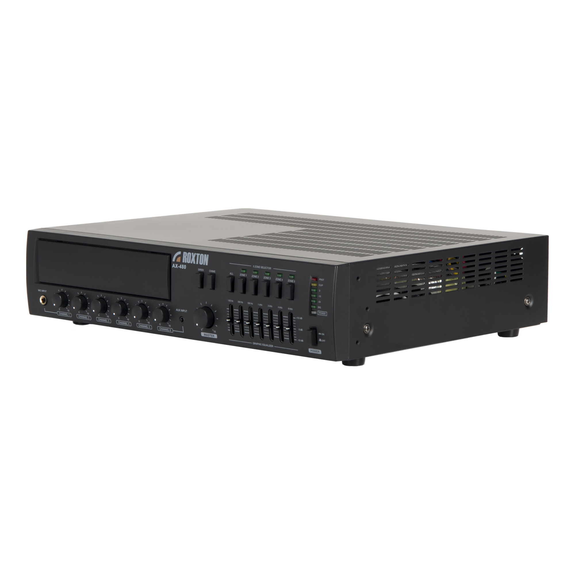 Встроенный селектор зон, коммутирующий высоковольтные выходы усилителя с пятью линиями громкоговорителей даёт возможность выбора, в какие зоны транслировать аудиосигнал. Помимо этого, ROXTON AX-480 оборудован 7-ми полосным графический эквалайзером выходного аудиосигнала позволяющего получать требуемую выразительность и громкость звучания транслируемой музыки и речи. Применение усилителя класса D и импульсный блок питания позволили добиться снижения веса усилителя и уменьшения потребляемой энергии без потери качества транслируемого звука. Сочетание огромного количества функций, простоты использования и надёжности сделали ROXTON AX-480 незаменимым при озвучивании кафе, баров, ресторанов, административных и офисных помещений.